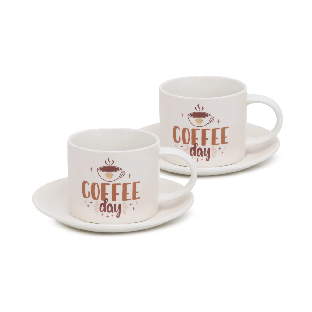 Чашки выполнены в стильном дизайне с надписью COFFEE DAY, которая сразу же привлекает внимание и создаёт атмосферу уюта и тепла. Каждая чашка вмещает 240 мл, что позволяет полностью насладиться вкусом кофе. https://fissman.ru/catalog/aksessuary-chay-kofe/chashki/chashki-dlya-kofe/chashki-s-blyudtsami-farforovye-240-ml-4-pr-soffee-day/