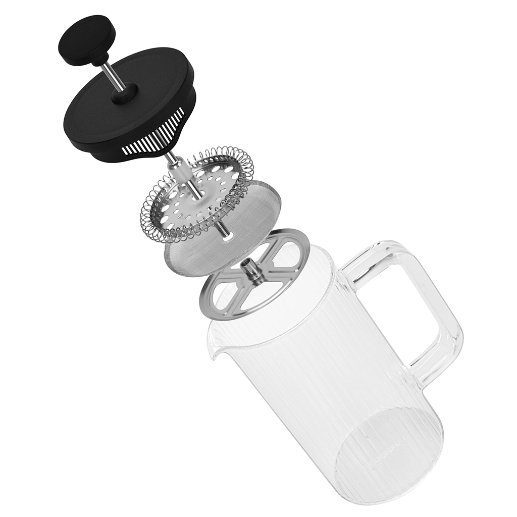 Колба из термостойкого стекла выдерживает высокие температуры, а прочный металлический корпус и ручка надежно защищают от ударов. Этот пресс создан для ежедневного использования.