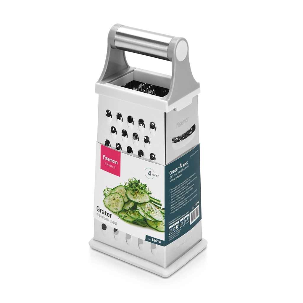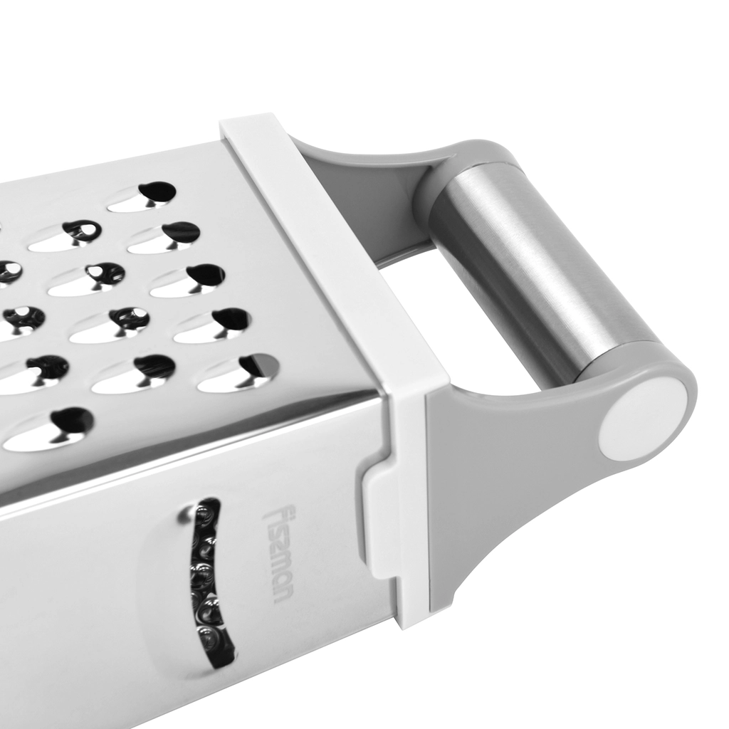 Терка четырехсторонняя 24,5 см изготовлена из нержавеющей стали. https://fissman.ru/catalog/aksessuary/terki-shinkovki-yaytserezki-choppery/terka-ruchnaya-24-5-sm-art-18614/