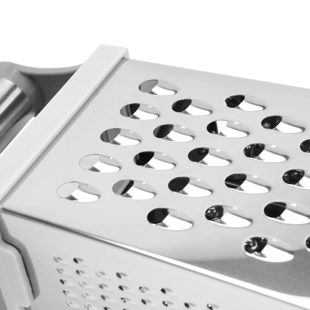 Классическая четырехсторонняя терка имеет поверхности для натирания пюре, крупной и мелкой соломки, ломтиков.