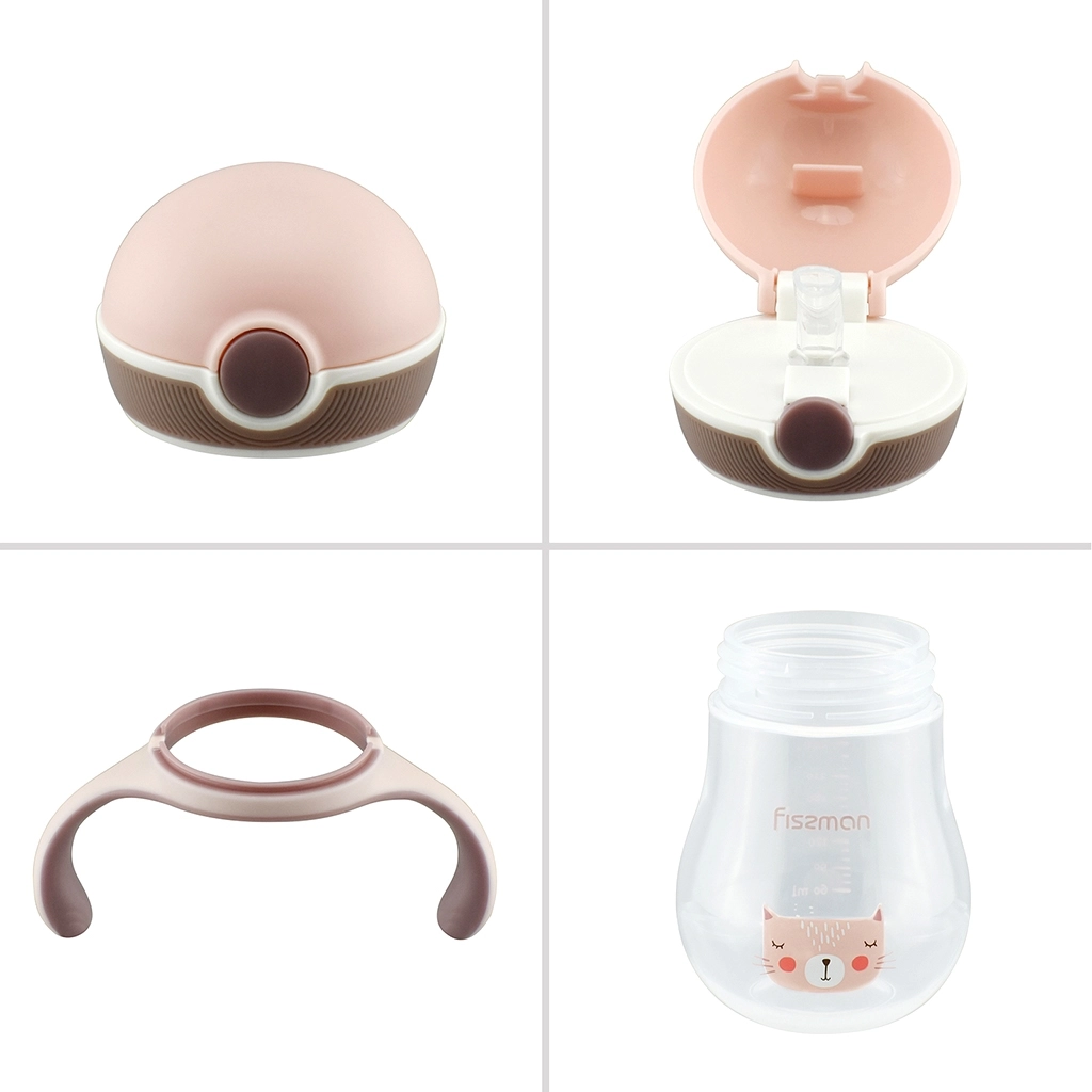 из пластика. Имеет широкое горлышко, благодаря которому легко мыть и наполнять поильник. Оснащен откидным клапаном под которым имеется трубочка. По бокам емкости размещены удобные дугообразные ручки. Перед первым применением тщательно промыть в горячей воде с добавлением моющего средства.