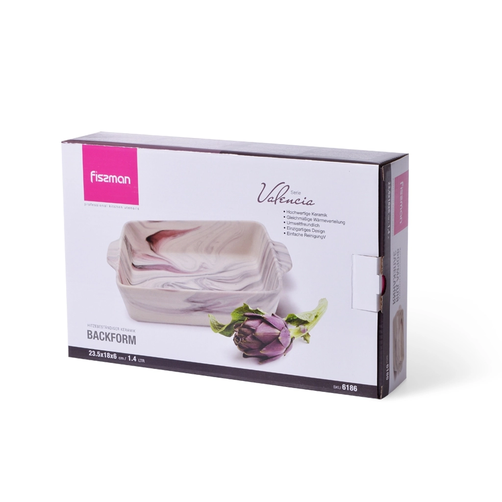 Форма для выпечки из керамики VALENCIA - фаворит как кулинара. Она позволяет готовить так, чтобы блюда получались не только вкусными, но и красиво поданными прямо на стол. Размер 23,5×18×6 см и объём 1,4 л идеально подходят для домашних пирогов, лазаньи, запеканок и сочного мяса с овощами.