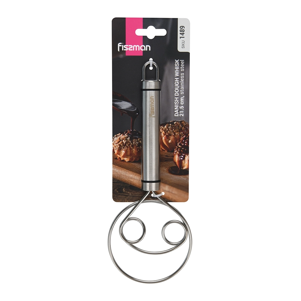 Датский венчик -легко и быстро замешивает тесто. От воздушного - для блинов, оладий, кексов, а также фруктовой начинки до тяжелого и липкого теста на ржаной хлеб. Идея его создания заключалась в том, чтобы оптимизировать процесс замешивания плотных по консистенции продуктов. Традиционные способы замеса теста, фарша или других вязких продуктов предполагали использования рук или ручного миксера, что отнимало достаточно много времени, усилий и доставляло сложности. С датским венчиком не требуются традиционные способы. Рабочая часть состоит из толстой проволоки, выполненной из нержавеющей стали марки INOX 304(18/10). Цилиндрические кольца расположены так, что любая густая https://fissman.ru/catalog/dlya-vypechki/inventar-dlya-vypechki/posuda-i-instrumenty-dlya-vypechki-tortov/datskiy-venchik-dlya-zamesa-testa-21-5-sm-art-1489/  смесь не налипает и не задерживается, как это часто бывает при использовании классического ручного венчика. Крепкое соединение и надежная стальная ручка не прогибается под тяжестью замеса теста, фарша или творожной массы. Датский венчик делает замес равномерным, гомогенизируя тесто, без лишнего воздуха и комочков. Хлеб получается с идеальной корочкой и мякишем. Так же он с легкостью справиться с замесом дополнительных ингредиентов в тесто, не нарушая их структуру. Можете быть уверенными ваши ягоды в тесте для маффинов останутся невредимыми. Он будет незаменимым помощником и при замешивании каш, тушеных блюд, густых соусов и более жидкого теста для оладий или блинчик