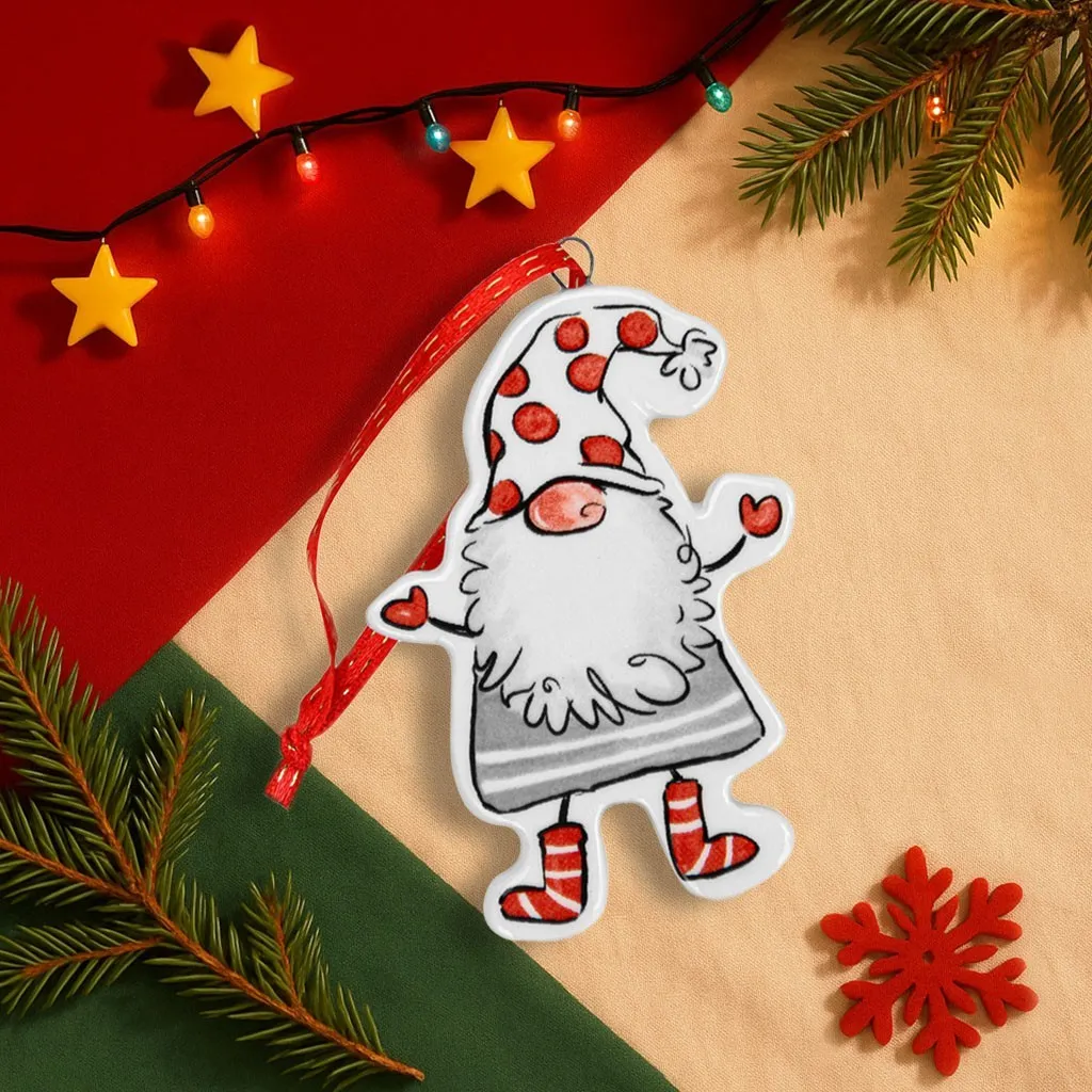 Ёлочная игрушка гармонично сочетается с другими элементами новогоднего декора, такими как новогодние ёлочные игрушки, шишки, свечи, мандарины или палочки корицы. Он может стать центральным элементом композиции, особенно если украсить его гирляндой. Рисунок гнома нанесён на обе стороны игрушки, что позволяет использовать её в любом положении.