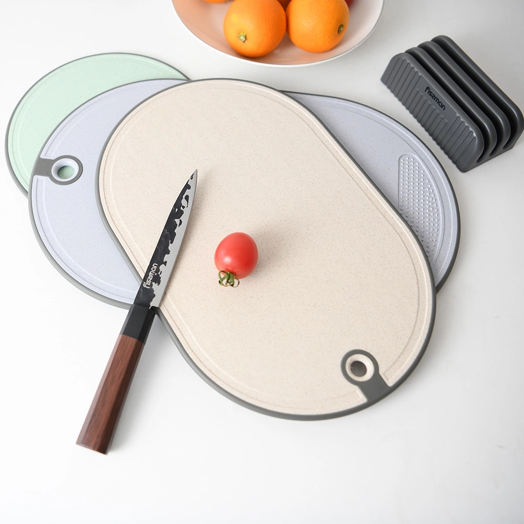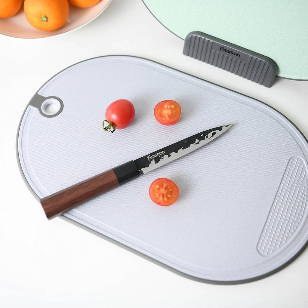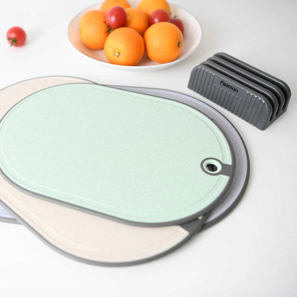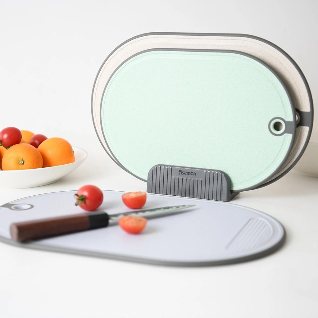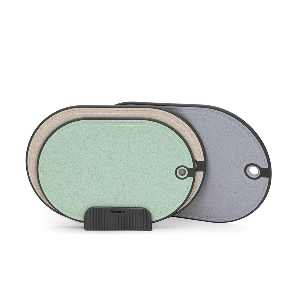 Набор разделочных досок 36 x 23 см, 32 x 21 см, 28 x 19 см в 3-х цветовых оттенках изготовлен из пластика. Каждая доска предназначена для разделки определенной группы продуктов.