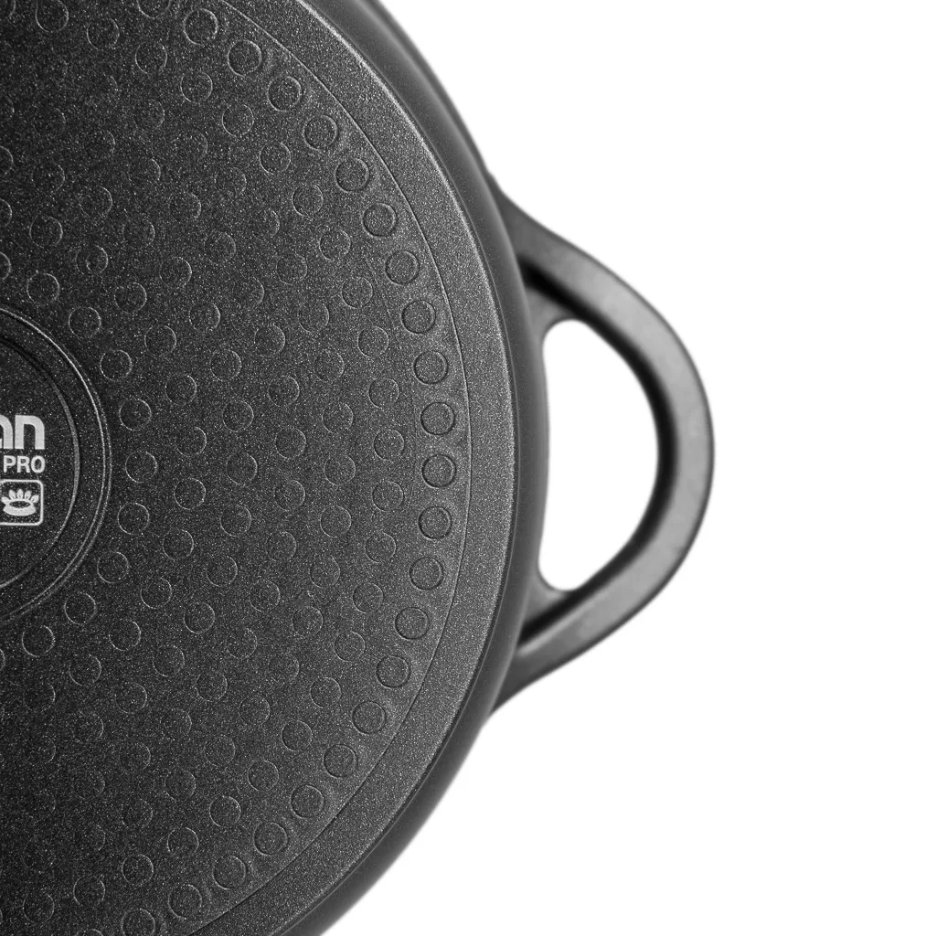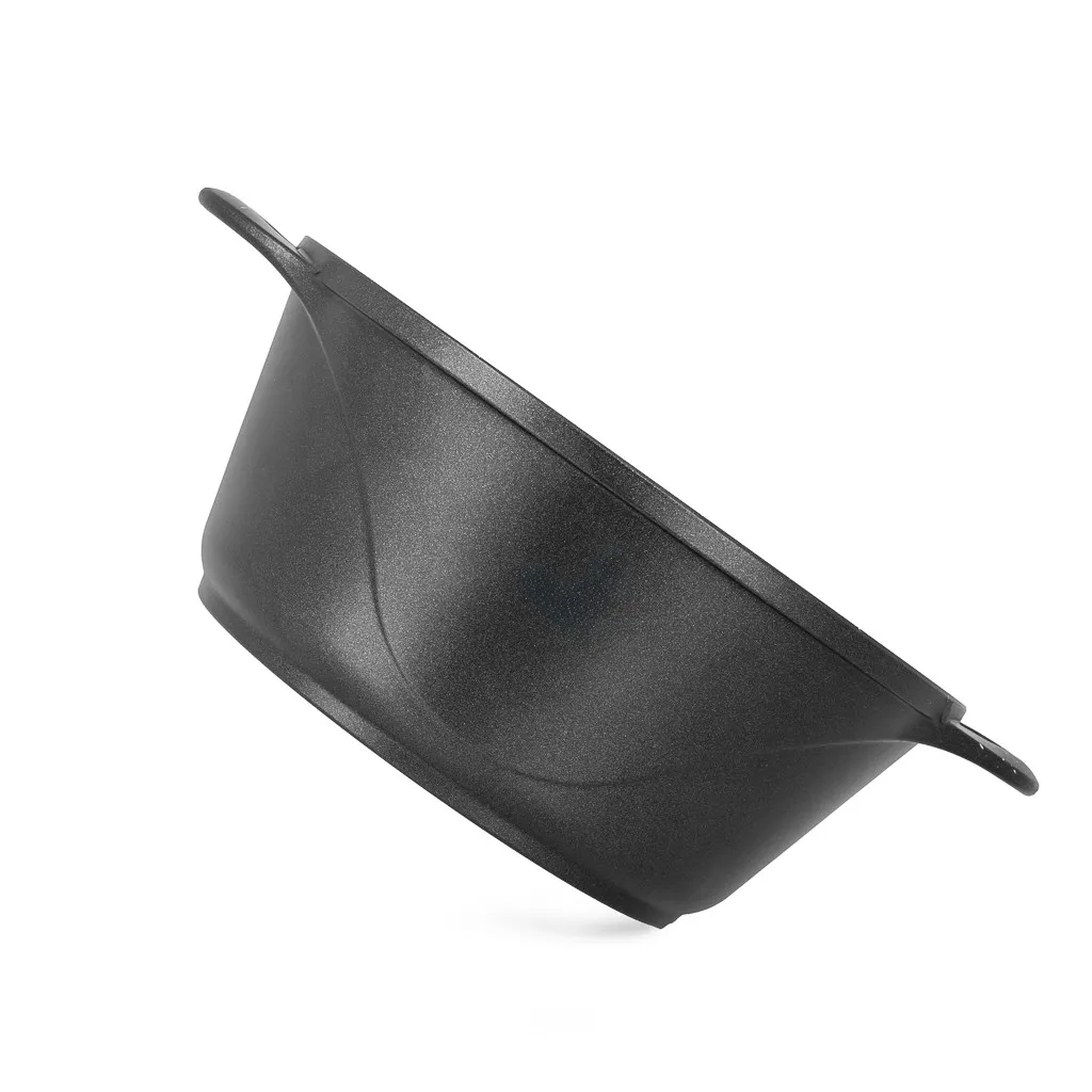 Одно из ключевых преимуществ Cook Pro — способность выдерживать нагрев до 300 градусов, что позволяет использовать кастрюлю на газовых и электрических плитах. Толстый и тяжёлый литой алюминий обеспечивает прочность, устойчивость к деформации и помогает сохранять тепло внутри кастрюли.