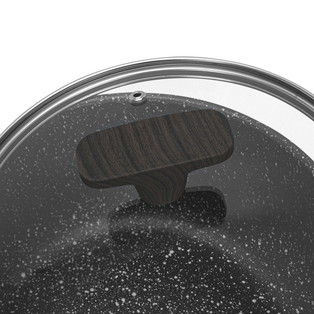 • Прозрачная стеклянная крышка с паровыпуском позволяет наблюдать за готовностью пищи, не открывая посуду, тем самым, исключая попадания брызг на кожу и одежду.