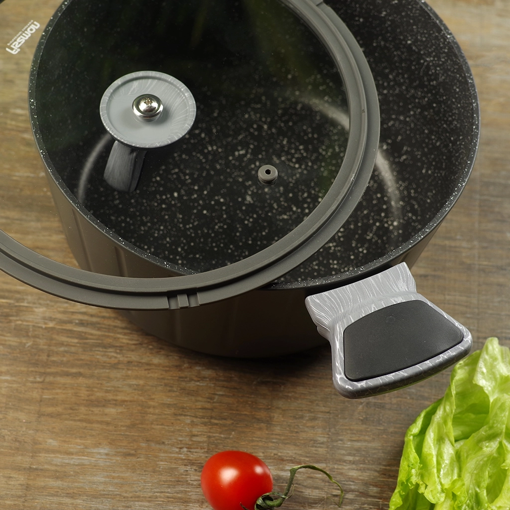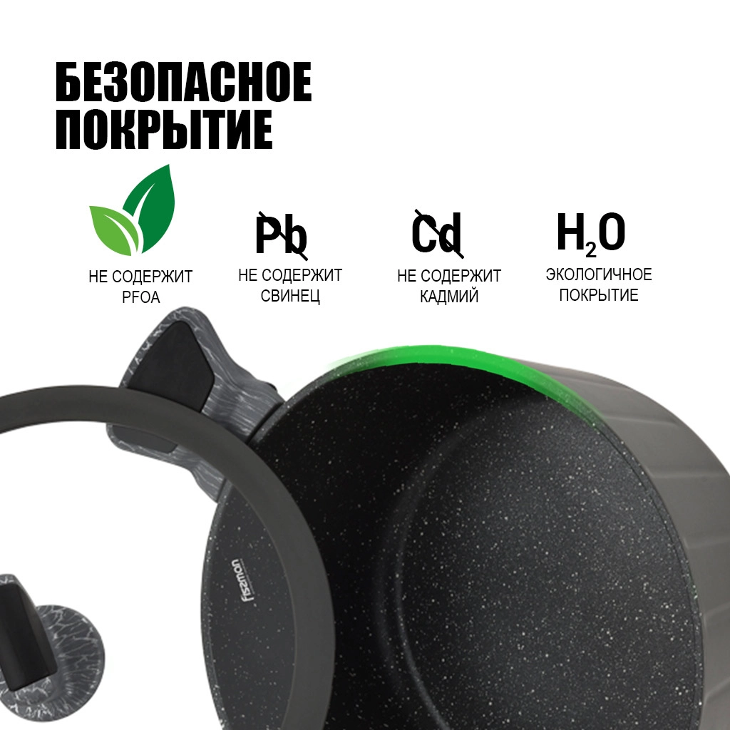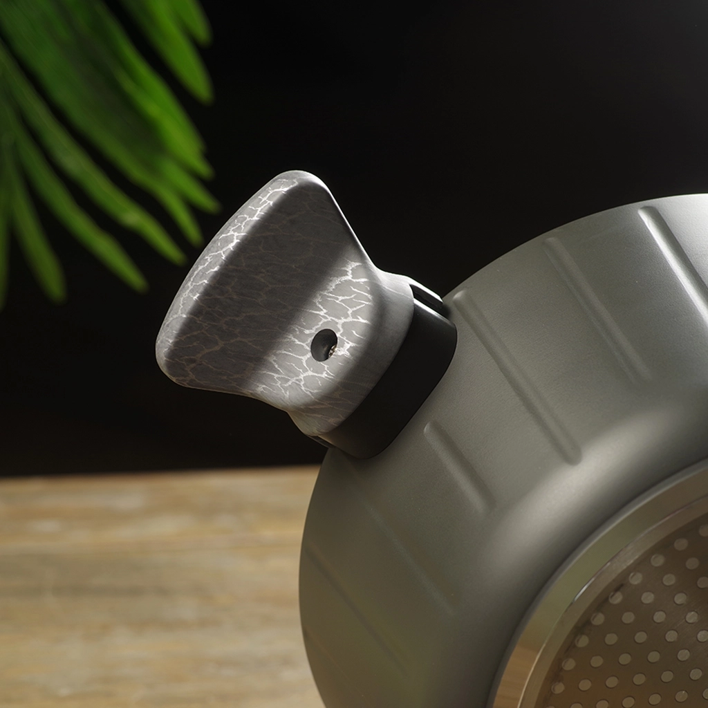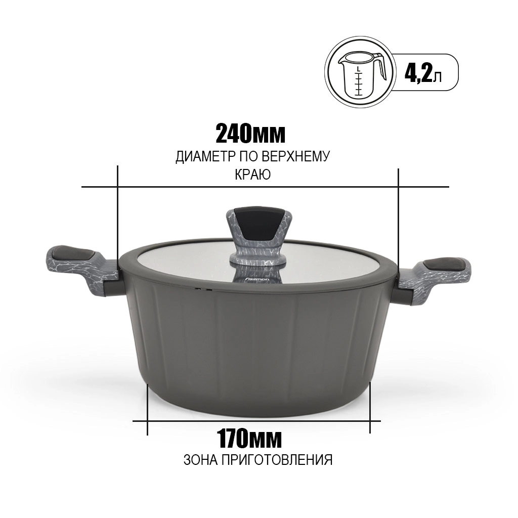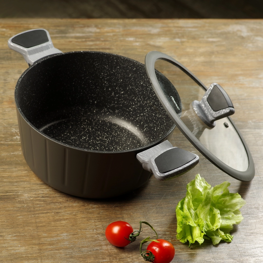 • Бакелитовые ручки с эффектом soft-touch и силиконовыми вставками, выполненные в благородном сером оттенке ‘под дерево’, приятны на ощупь, не скользят в руках, не нагреваются во время готовки.