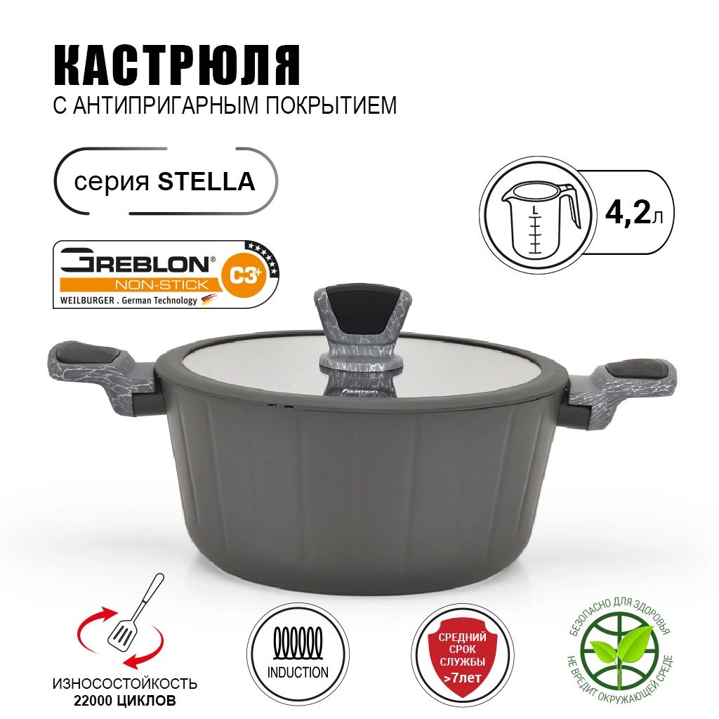 Серия посуды STELLA от FISSMAN — это выбор тех, кто не терпит компромиссов, когда речь идет о качестве. Каждое изделие - словно произведение искусства, сочетающее в себе надежность, универсальность и долговечность. Приобретая такую посуду, вы делаете вклад в самое дорогое, что у нас есть - здоровье. Улучшайте свой быт, выбирая лучшее из того, что предлагает FISSMAN