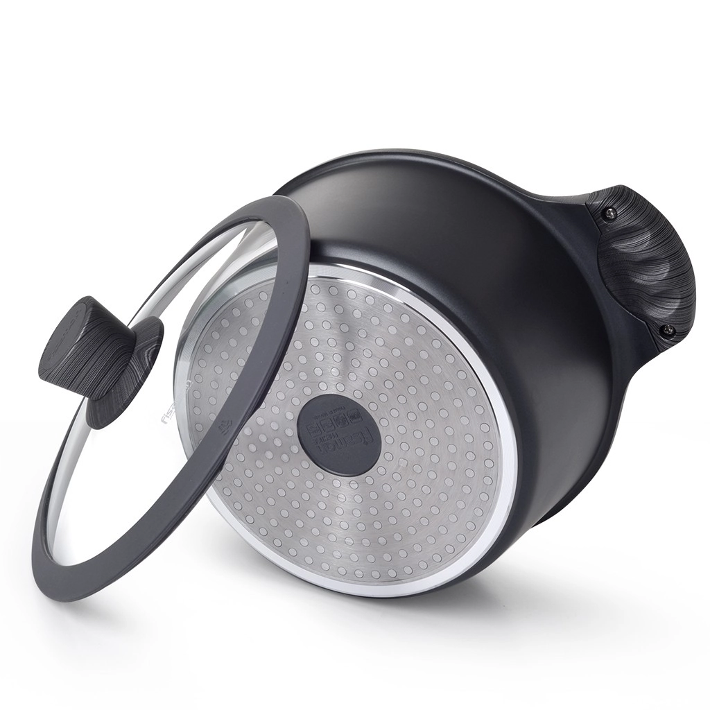 • Стеклянная крышка с силиконовым ободком плотно прилегает, не скользя и не царапая покрытие, позволяет наблюдать за готовностью пищи, не открывая посуду, тем самым, исключая попадания брызг на кожу и одежду.