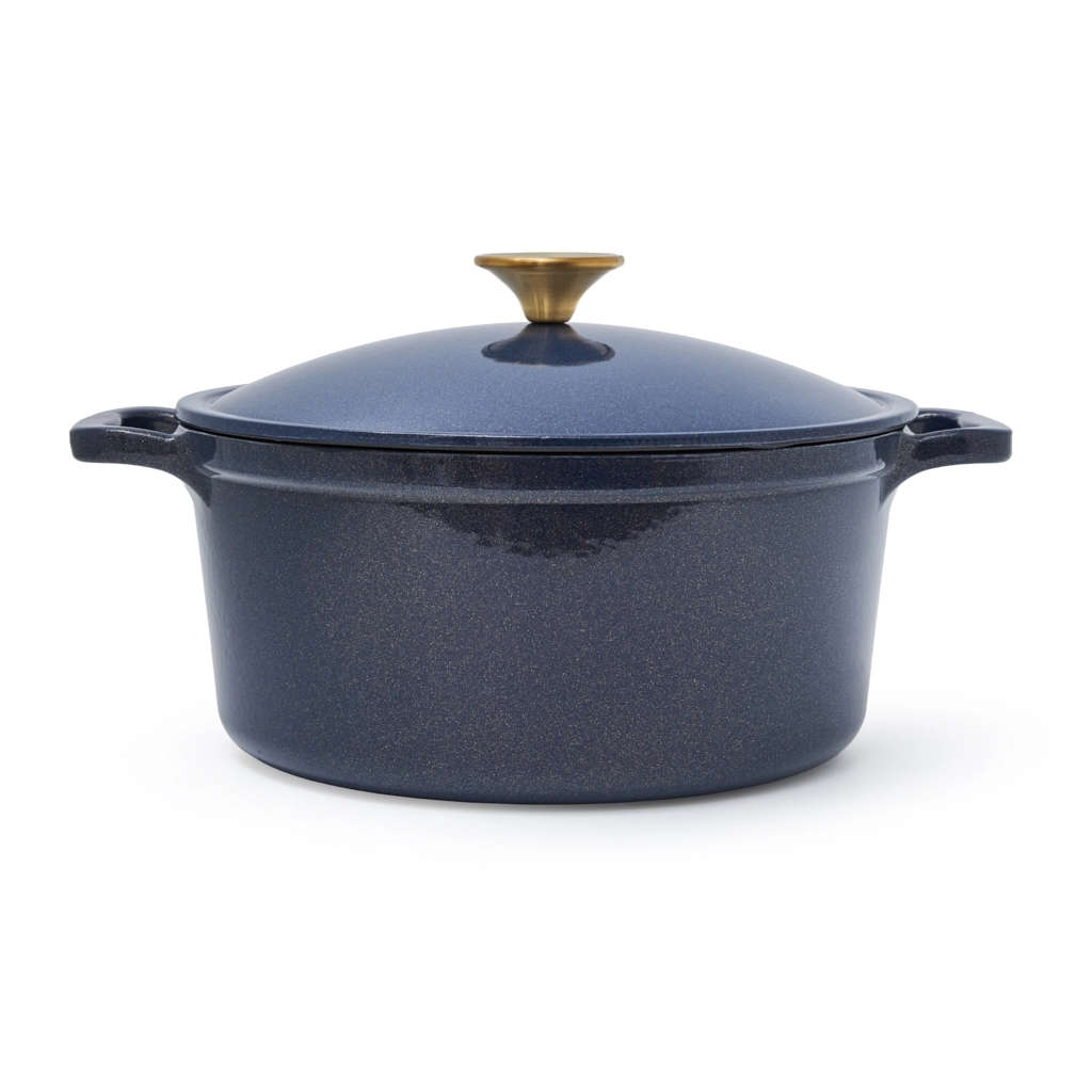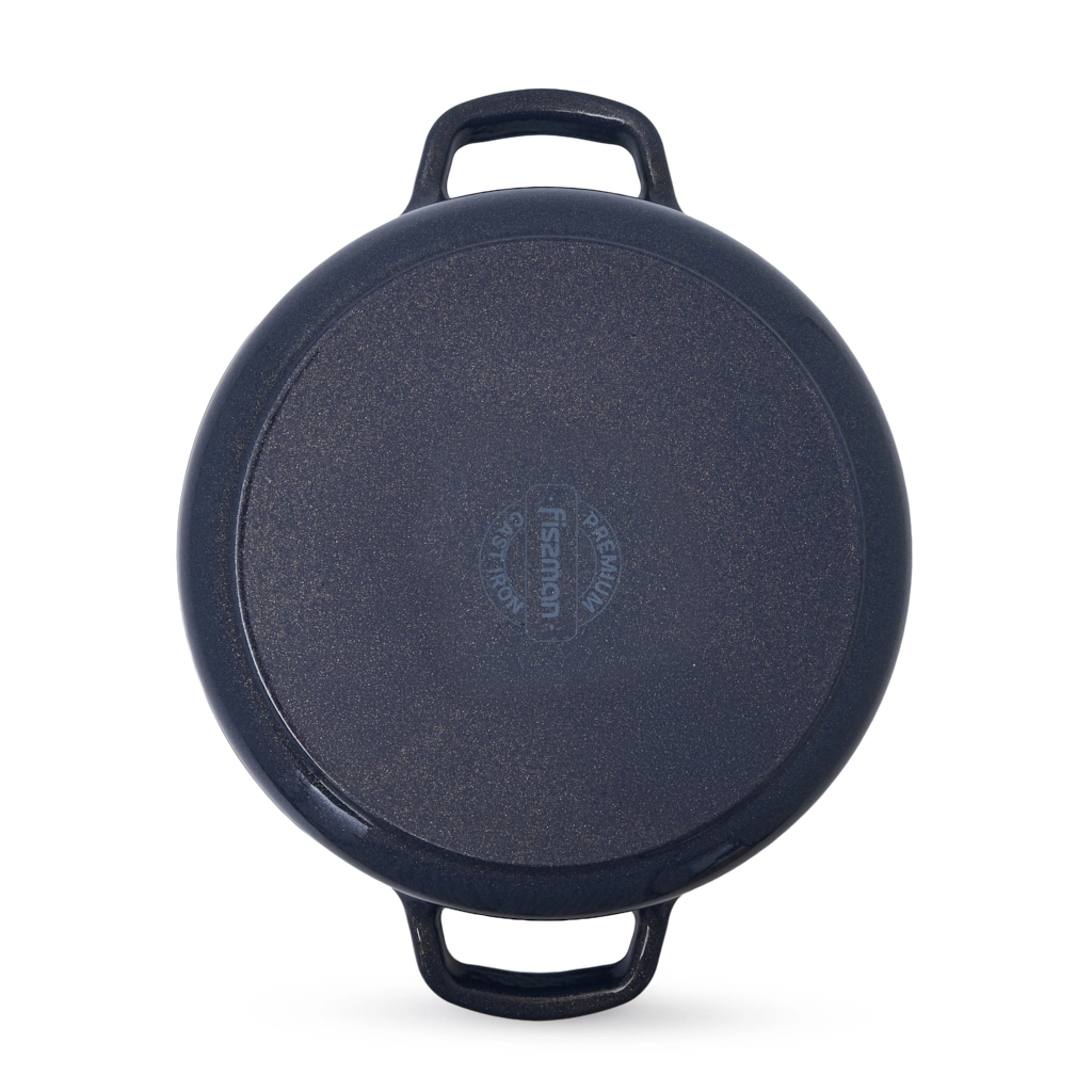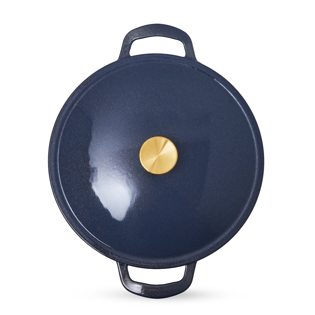 - Удобство и стиль: широкие чугунные ручки по бокам обеспечивают надёжный и комфортный захват. Ручка крышки с отделкой под матовое золото добавляет стильный акцент.