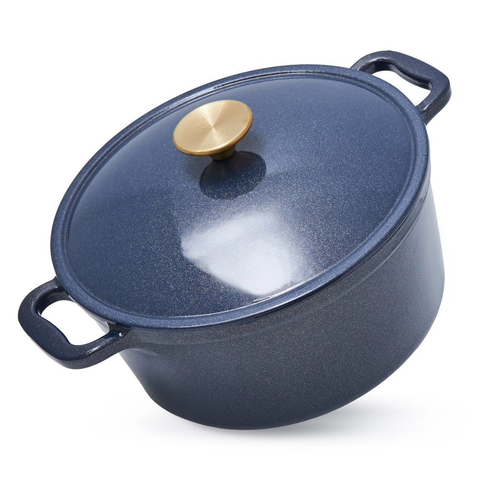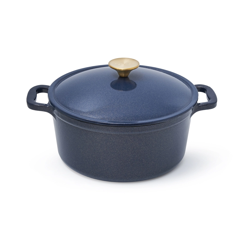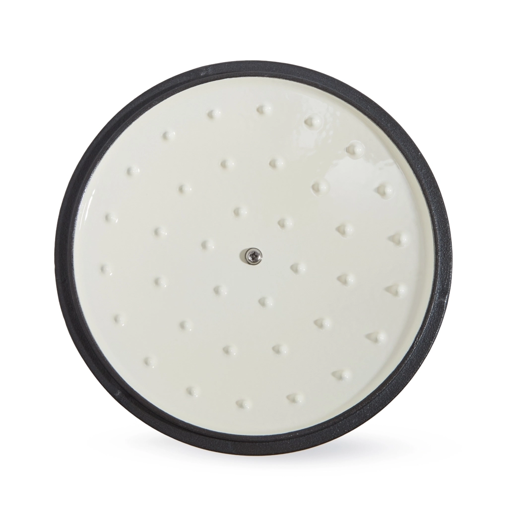 - Удобство и стиль: широкие чугунные ручки по бокам обеспечивают надёжный и комфортный захват. Ручка крышки с отделкой под матовое золото добавляет стильный акцент.