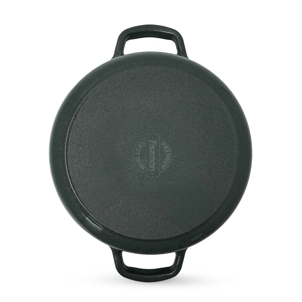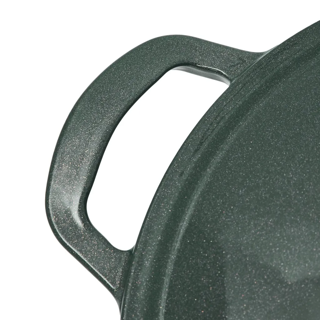 - Удобство и стиль: широкие чугунные ручки по бокам обеспечивают надёжный и комфортный захват. Ручка крышки с отделкой под матовое золото добавляет стильный акцент.