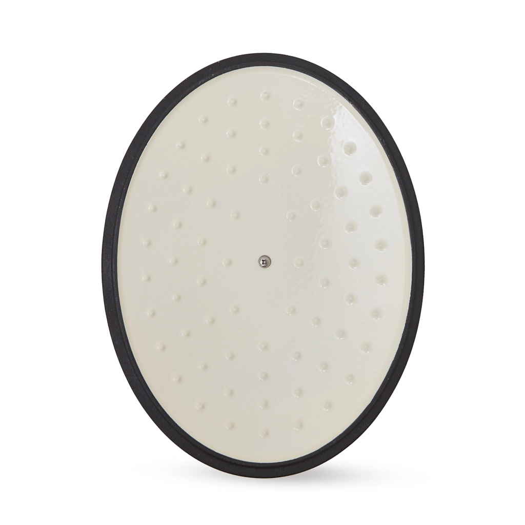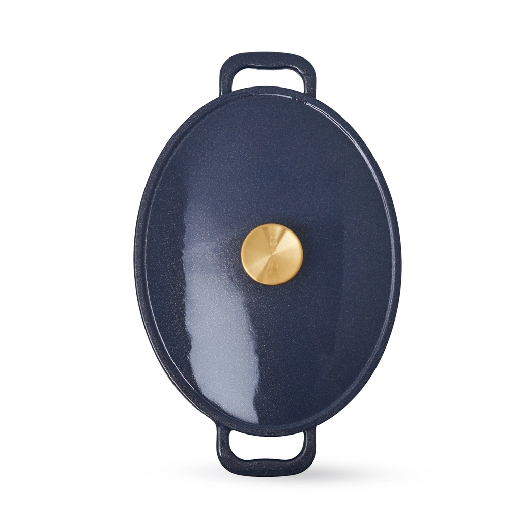 - Удобство и стиль: широкие чугунные ручки по бокам обеспечивают надёжный и комфортный захват. Ручка крышки с отделкой под матовое золото добавляет стильный акцент.