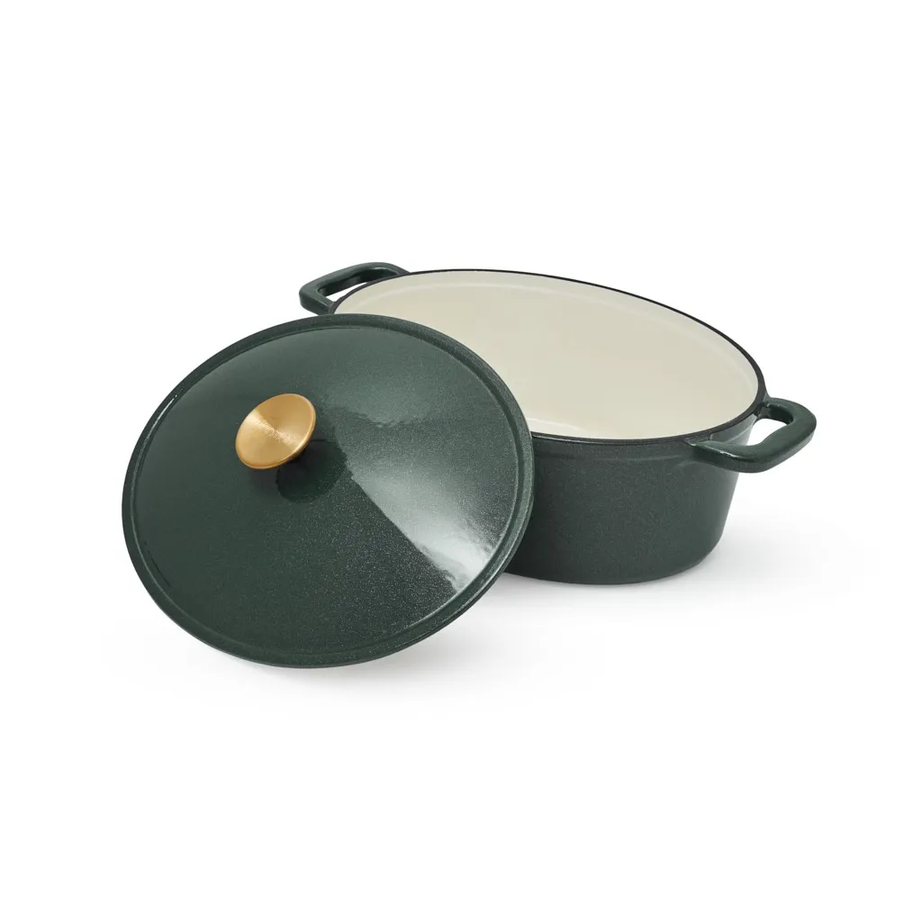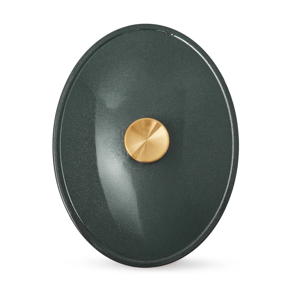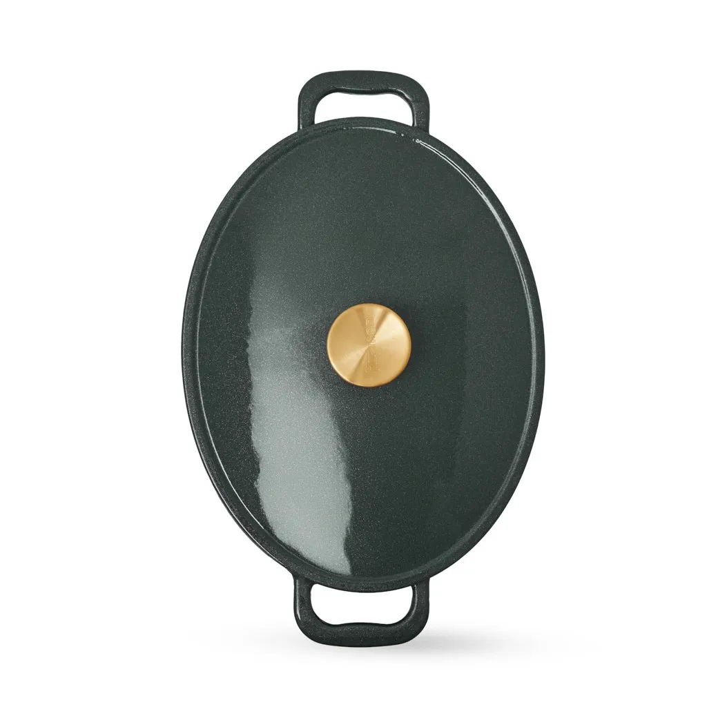 - Удобство и стиль: широкие чугунные ручки по бокам обеспечивают надёжный и комфортный захват. Ручка крышки с отделкой под матовое золото добавляет стильный акцент.