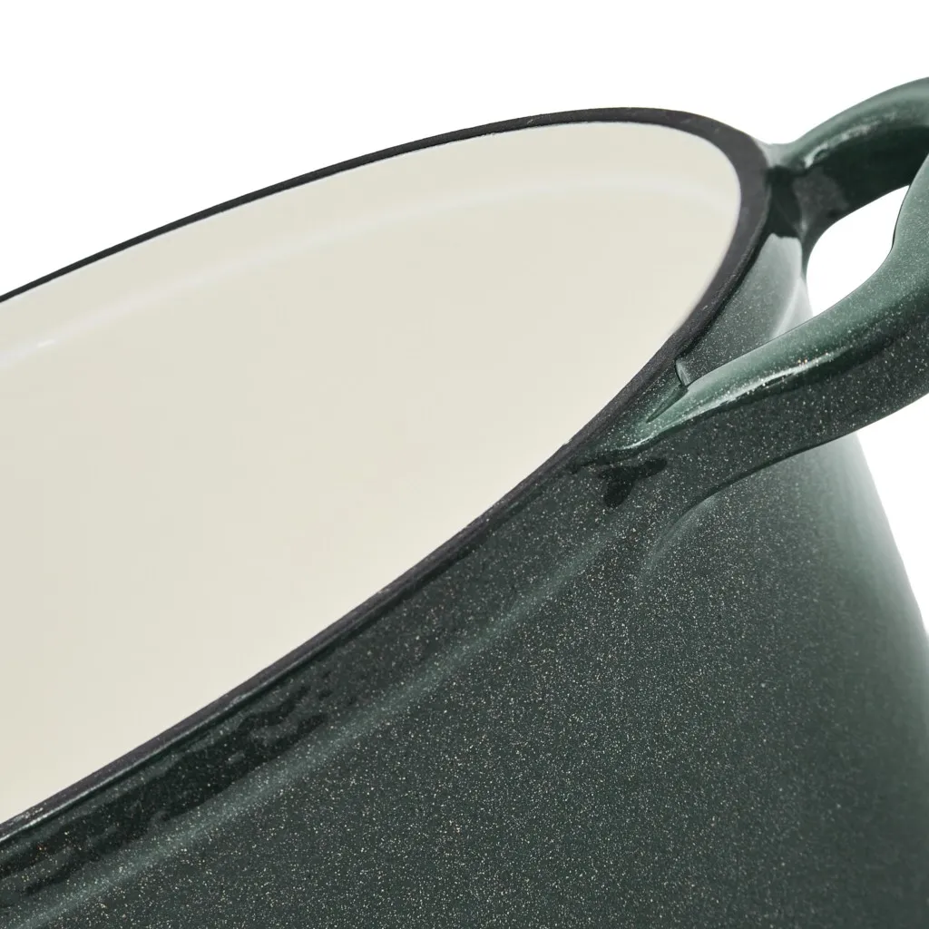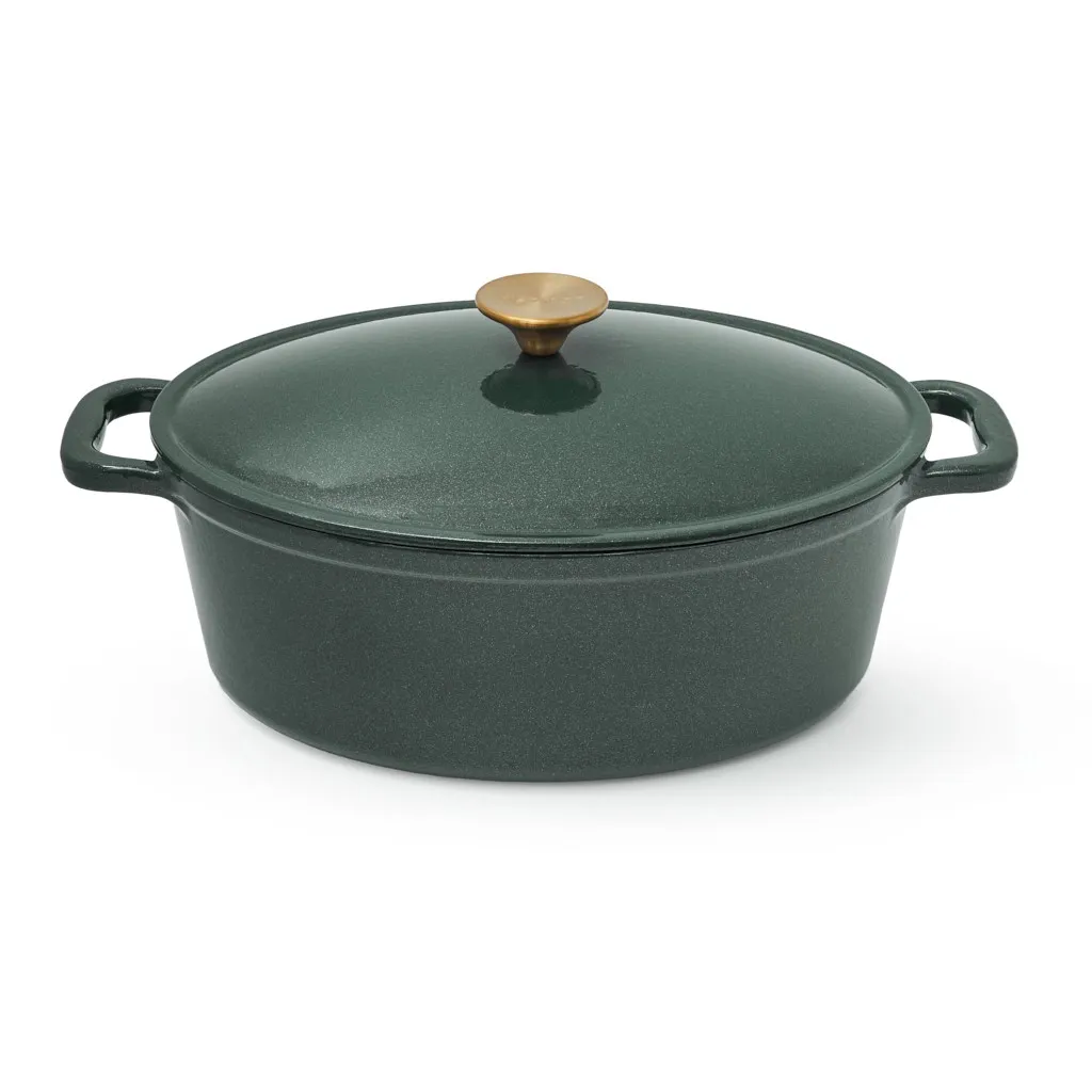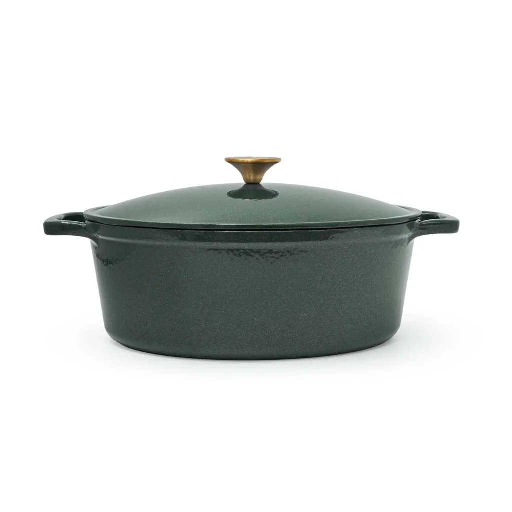 - Удобство и стиль: широкие чугунные ручки по бокам обеспечивают надёжный и комфортный захват. Ручка крышки с отделкой под матовое золото добавляет стильный акцент.
