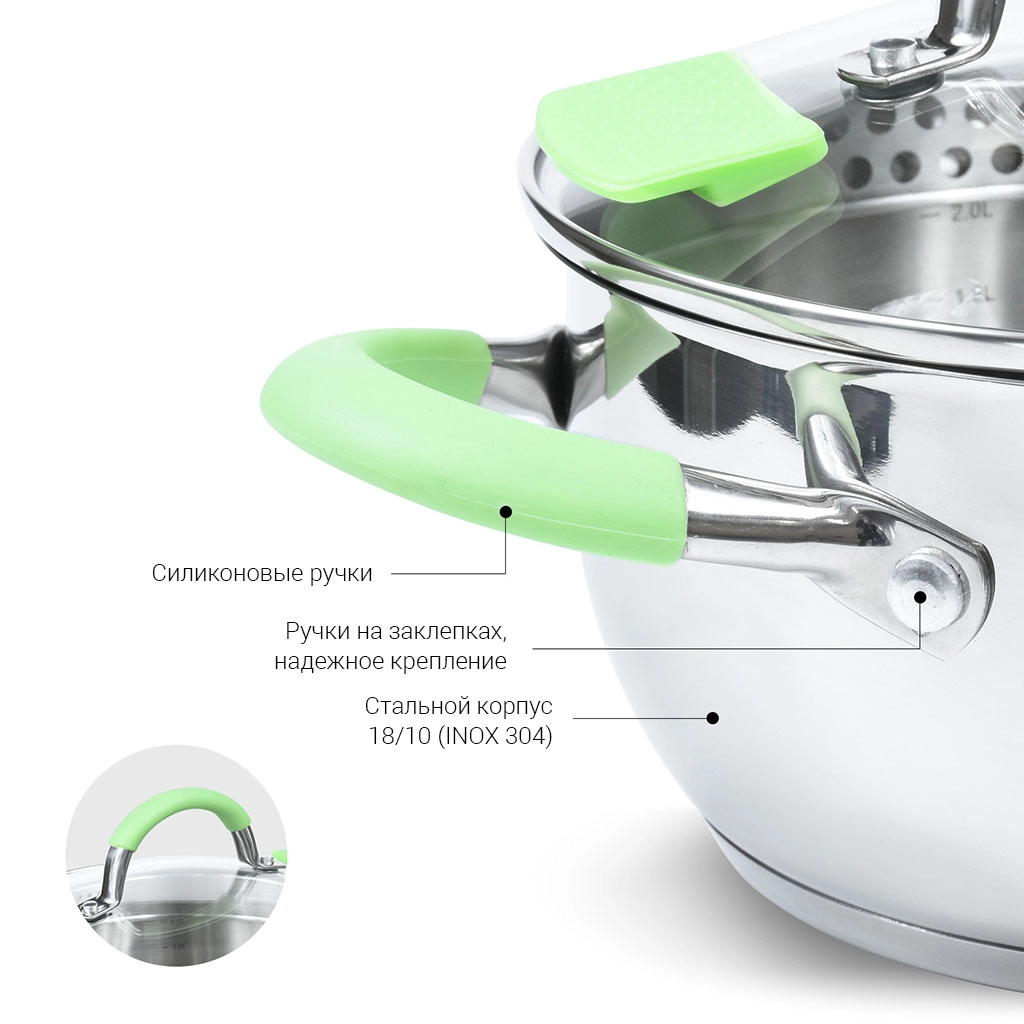 • Ручки из нержавеющей стали на заклёпках с силиконовой оболочкой (не нагреваются, не скользят)
