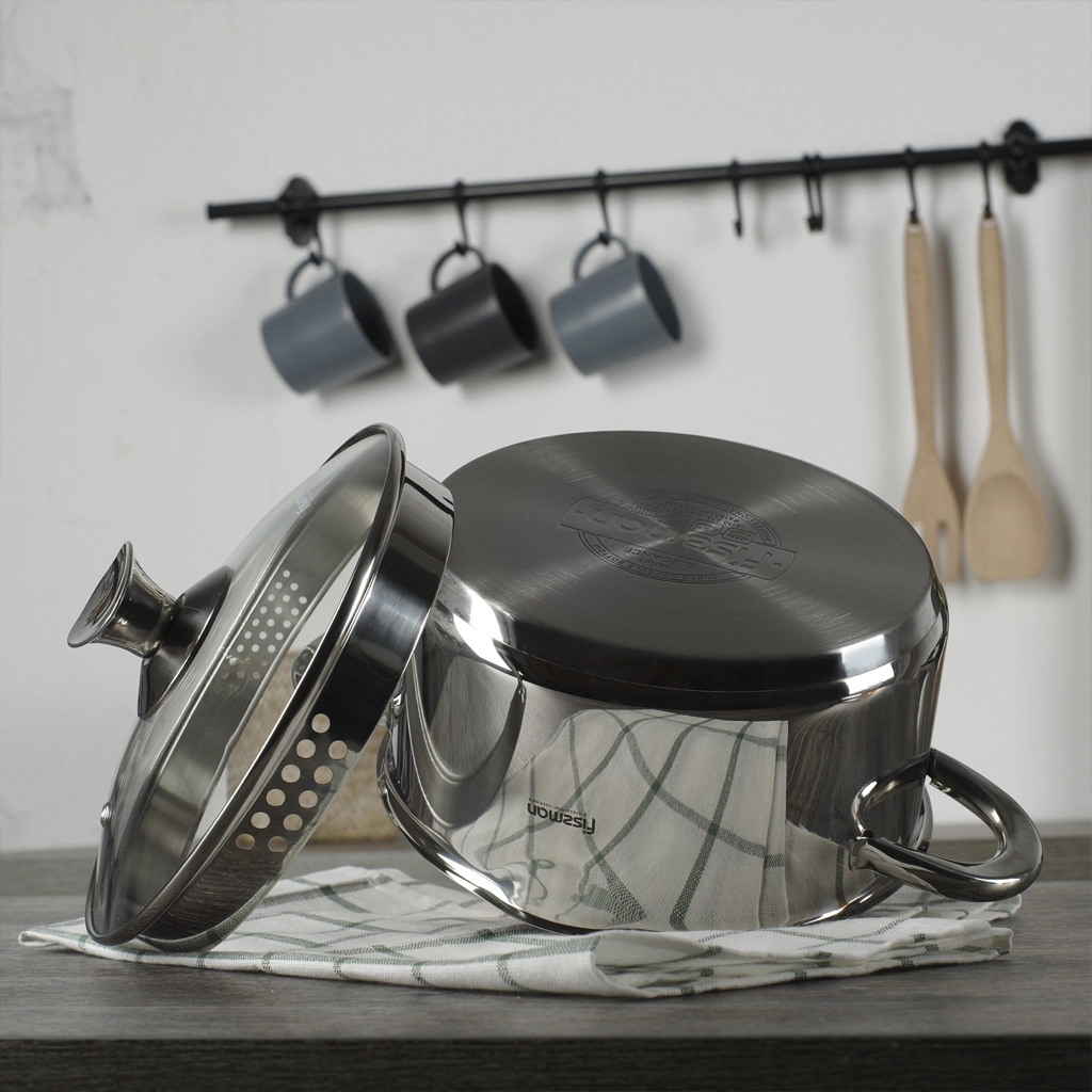 Кастрюли ELEGANCE – это комбинация современных технологий и продуманного дизайна. Многослойное дно ускоряет нагрев и исключает локальный перегрев, что делает готовку равномерной и энергоэффективной. А крышка с бортиком для слива воды позволяет легко избавляться от лишней жидкости без использования дуршлага – мелкая деталь, которая экономит время и делает процесс удобнее.
