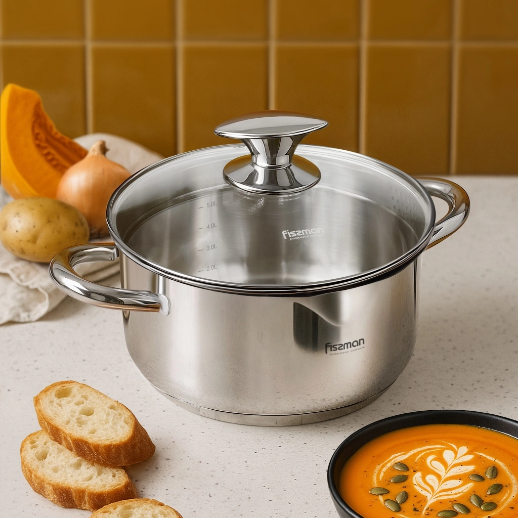 Объём 5,6 л – оптимален для приготовления супов и бульонов на 4–6 персон. Если вы часто готовите пасту или овощи, используйте крышку с бортиком: это безопаснее и быстрее, чем переливать в отдельное сито.