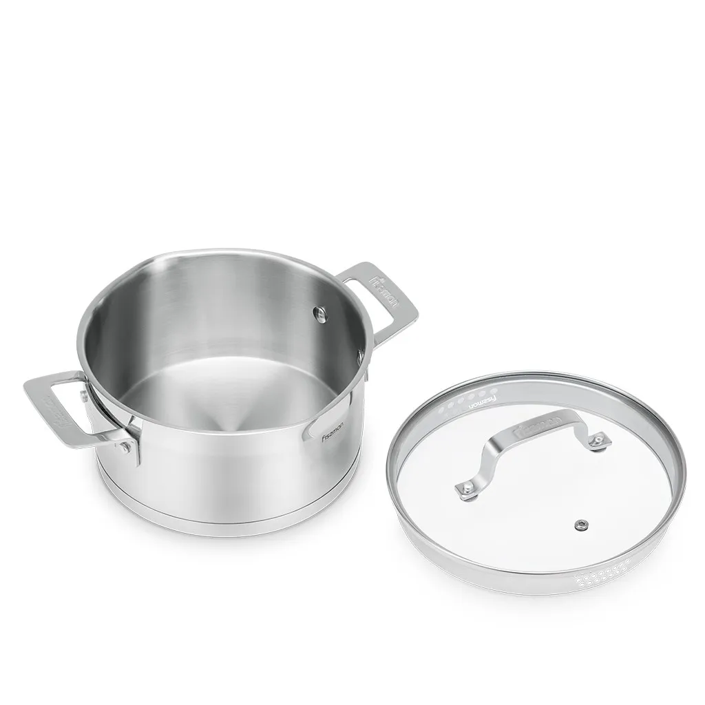 Нержавеющую кастрюля с толстым дном FOBUS 24 см (5,1 л) – это вместительная посуда для приготовления больших порций. Объём 5,1 л идеально подходит для супов, бульонов, плова или тушёных блюд на всю семью. Высококачественная медицинская сталь 18/10 и усиленное дно гарантируют долговечность и эффективность.