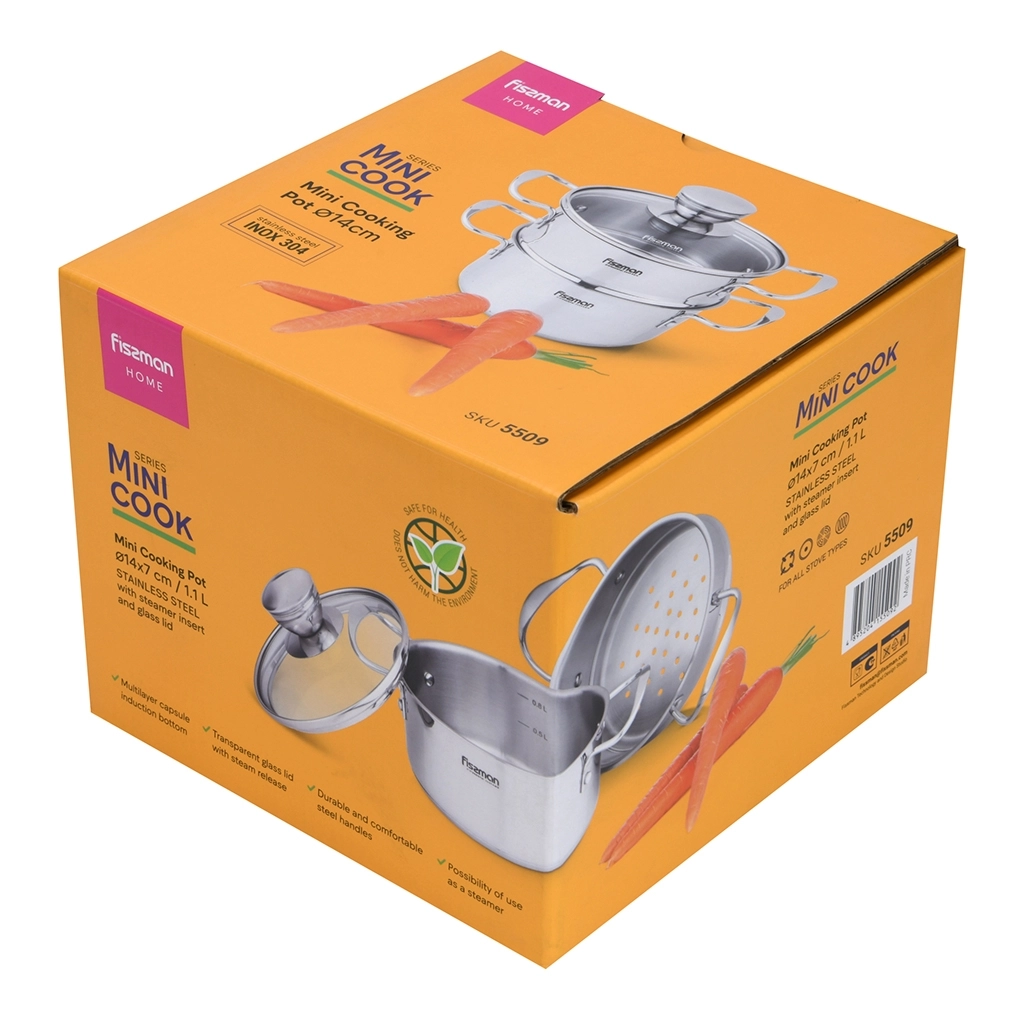 Компания FISSMAN уделяет особое внимание качеству своей продукции и заботится о своих клиентах. Серия посуды MINI COOK изготовлена из высококачественной нержавеющей стали марки 18/10 (INOX304), которая обладает коррозионной стойкостью и легко чистится. Многослойное капсульное дно обеспечивает равномерный нагрев и распределение тепла благодаря алюминиевой прослойке, сохраняя вкус и пользу продуктов. Индукционный слой делает посуду универсальной для всех типов плит.