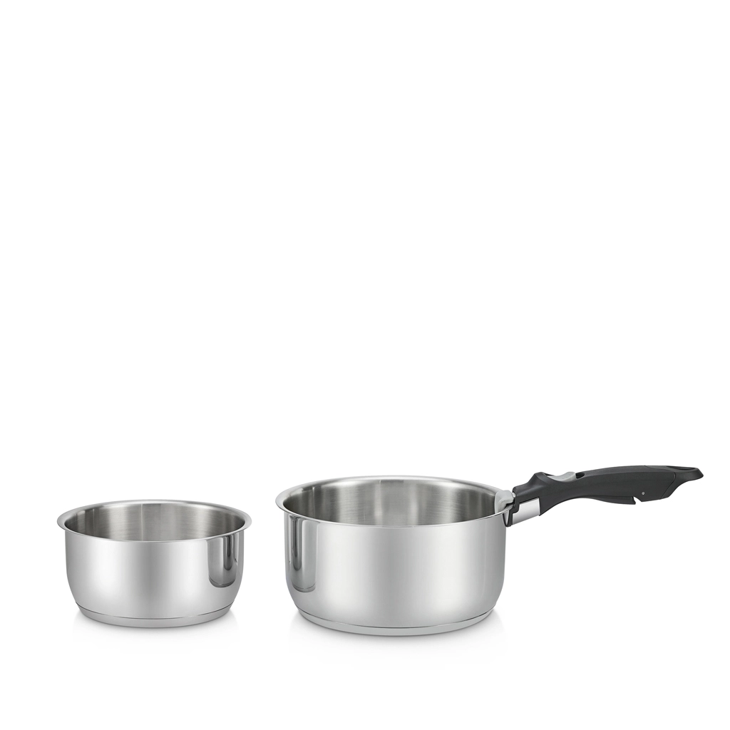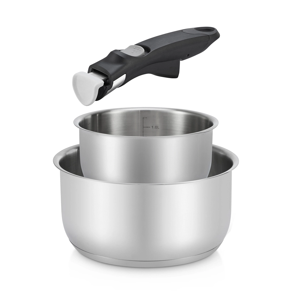 Набор состоит из кастрюли 16 см / 1,5 л; кастрюли 20 см / 3 л и съемной ручки.