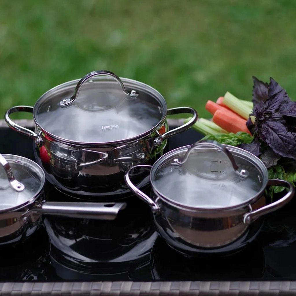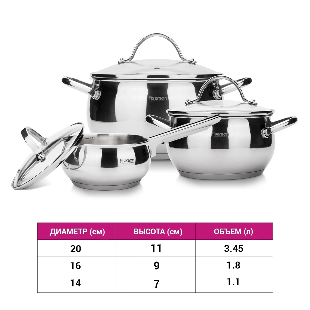 Набор посуды состоит из ковша 14 см / 1,1 л; кастрюли 16 см / 1,8 л; кастрюли 20 см / 3,45 л; крышки 14 см; крышки 16 см; крышки 20 см.