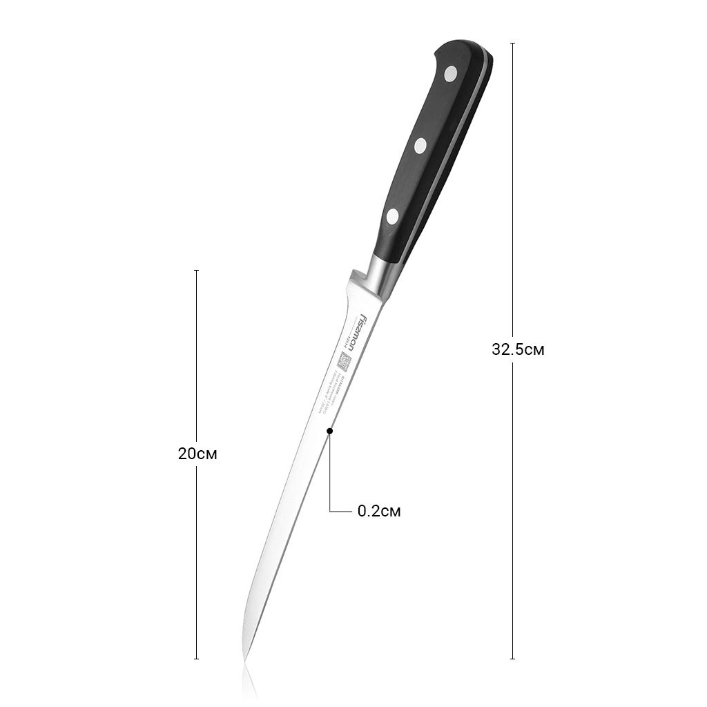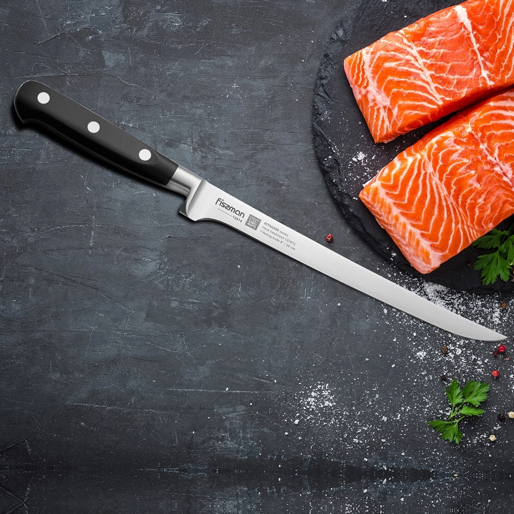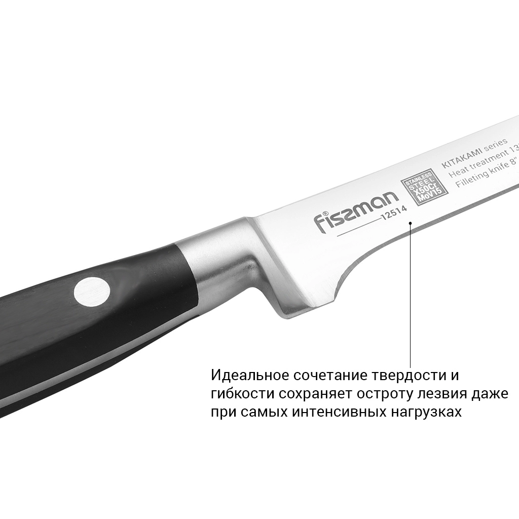 Филейный нож - бесценный помощник при нарезке. Он предназначен для получения филе рыбы, мяса и птицы. За счет длинного и узкого (иногда гибкого) лезвия легко добиться тонких, идеально ровных ломтиков. Кухонные ножи серии KITAKAMI выполнены из высоколегированной немецкой стали X50CrMoV15, закаленной до 57 единиц по шкале Роквелла и имеют множество преимуществ.