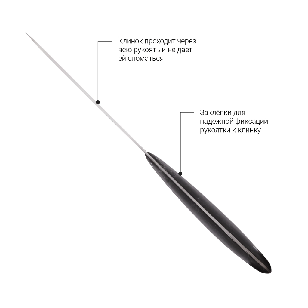 • Гастрономический нож 16 см. За счет длинного узкого лезвия позволяет получить тончайшие ломтики любых продуктов. Незаменим в приготовлении традиционных японских блюд — суши и сашими.