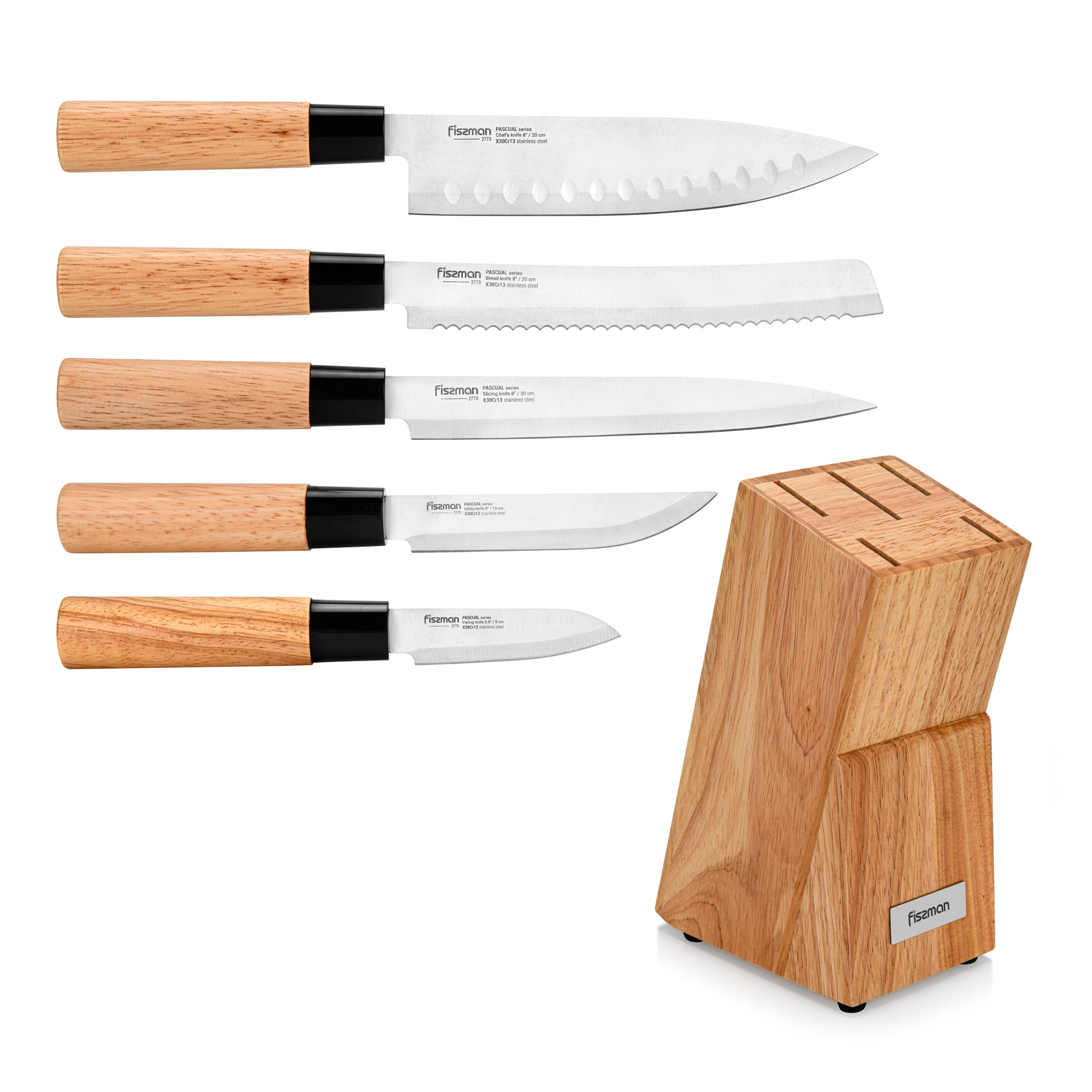 Набор ножей PASCUAL от компании FISSMAN в деревянной подставке — функциональный и стильный атрибут современной кухни.