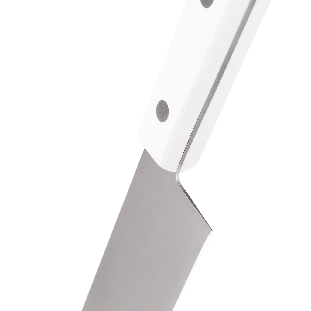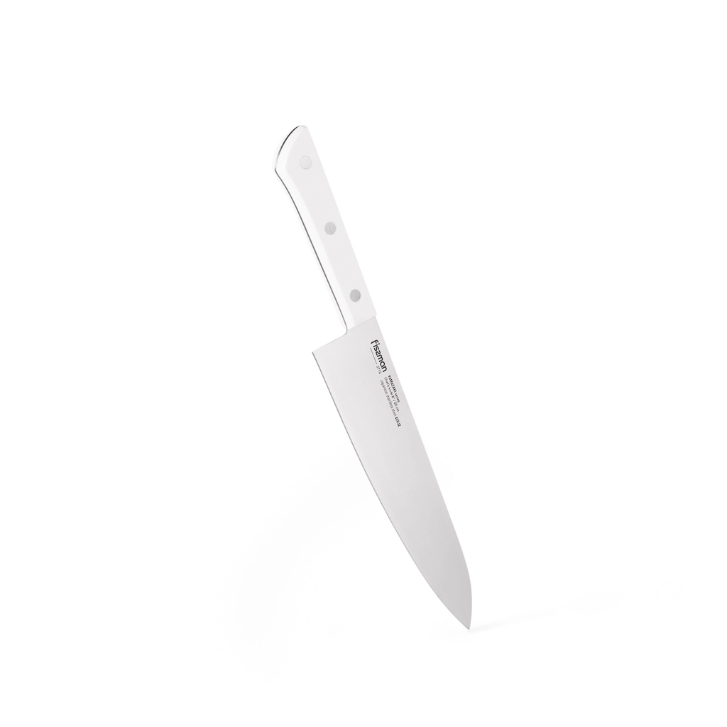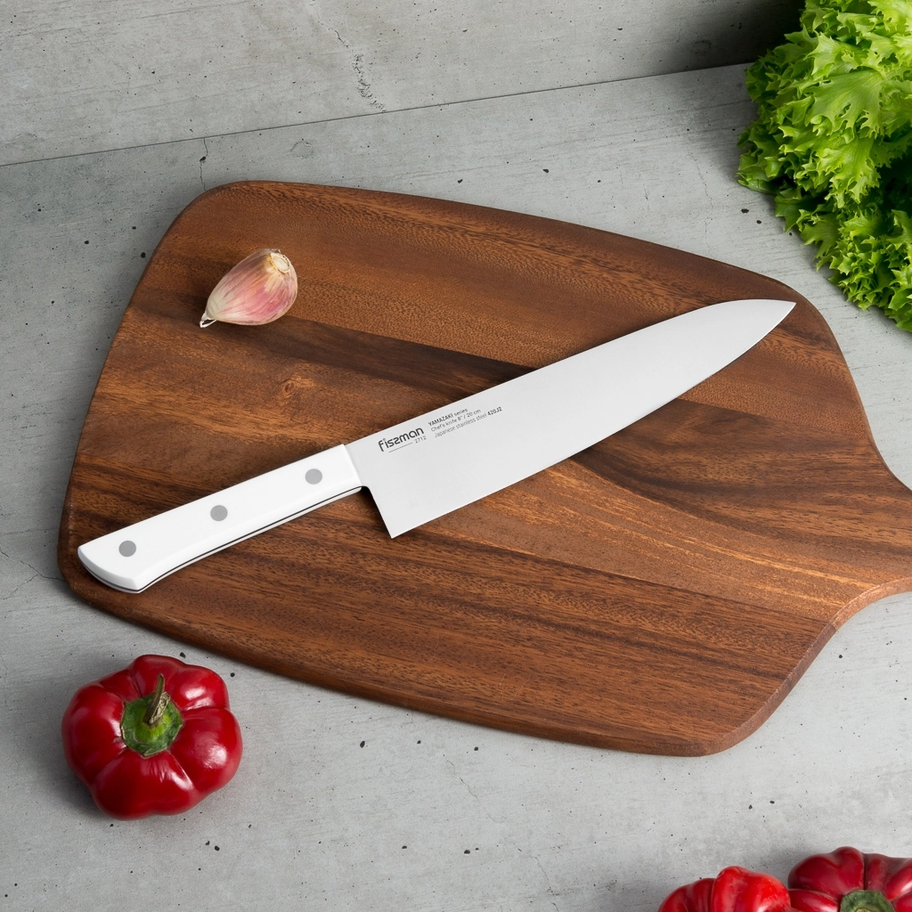 • Поварской нож 20 см – незаменимый помощник на кухне. Им можно нарезать филе, нашинковать овощи, разделать мясо. Им также легко давить чеснок и другие специи, отбивать заготовки для стейков или разбивать панцирь крабов.