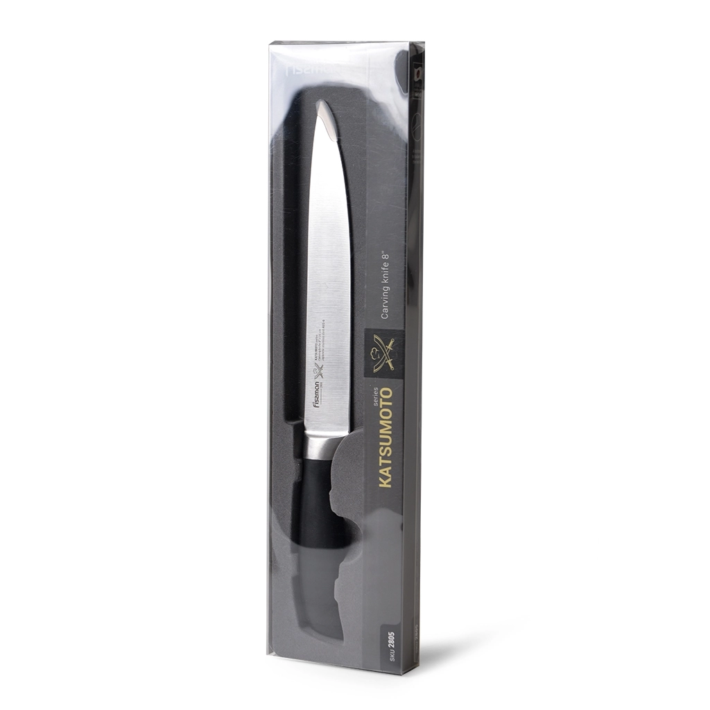 Гастрономический нож – выбор знатоков. Он подойдет для нарезки любых продуктов на идеально тонкие кусочки благодаря длинному и узкому лезвию. Он пригодится и для приготовления блюд японской кухни – суши и сашими. Кухонные ножи серии KATSUMOTO выполнены из высоколегированной японской стали AUS-6, закаленной до 57 единиц по шкале Роквелла и имеют множество преимуществ.