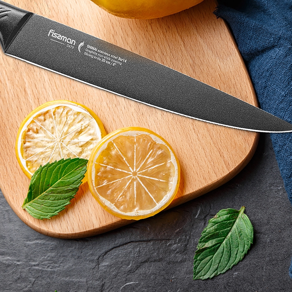 Благодаря покрытию Graphite non-stick coating продукты не прилипают к клинку при нарезании, а сталь максимально защищена от повреждений.
