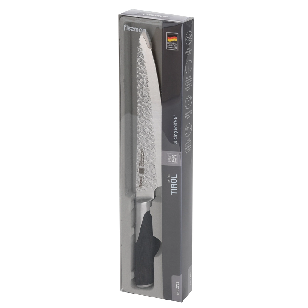 Гастрономический нож с длинным узким лезвием - идеален для нарезки на тончайшие кусочки красного мяса, мяса курицы или индейки, ветчины, жаркого, грудинки. Он практически незаменим если вам надо приготовить традиционное японское блюдо из сырой рыбы - суши и сашими. Все ножи серии TIROL изготовлены из высококачественной немецкой стали X50Cr15MoV, известной своими отличными механическими свойствами, обладающей прекрасной вязкостью, твердостью (HRC 55 единиц по шкале Роквелла) и коррозионной стойкостью и способной длительное время держать превосходный рез. Классическая европейская заточка, симметричная по всей длине режущей кромки, обеспечит невероятное удобство при работе. Отделка вручную поверхности лезвия молотом уменьшает трение и налипание продуктов на лезвие. Элегантная рукоять из изящного материала Pakka Wood имеет эргономичную форму и обеспечит удобный захват. Изготовленные в соответствии с профессиональными стандартами, надежные и хорошо сбалансированные ножи прослужат вам очень долго. FISSMAN поможет в реализации Ваших самых смелых идей на кухне! Легкий завтрак, сытный обед, изысканный ужин - FISSMAN поможет в реализации любых идей!