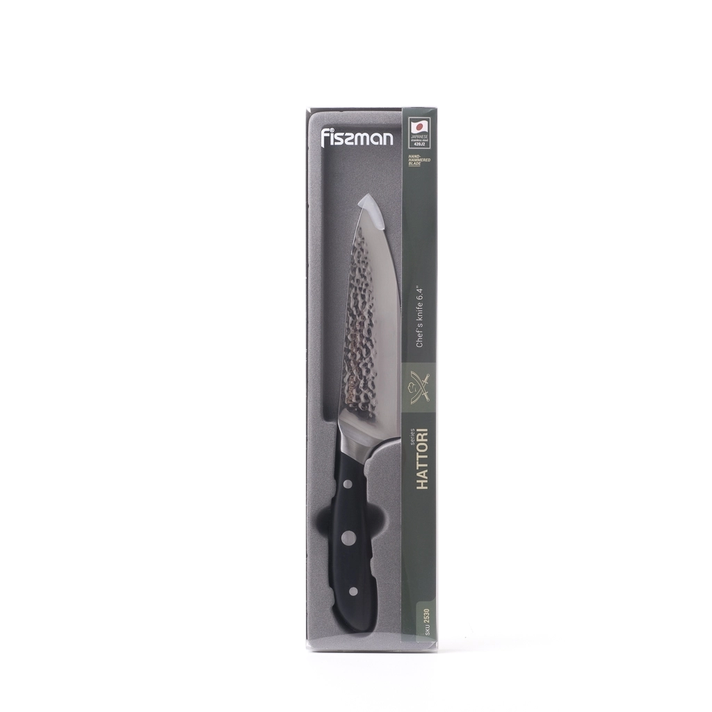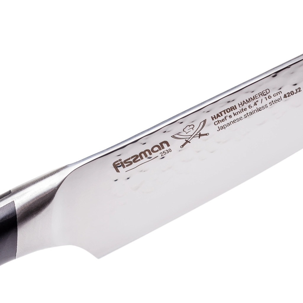 В серию HATTORI вошли кухонные ножи из японской стали 420J2. Она была разработана для изделий, эксплуатирующихся в условиях повышенной влажности. Эта сталь прочная и износостойкая, закаленная до 53 +/-2 единиц по шкале Роквелла.