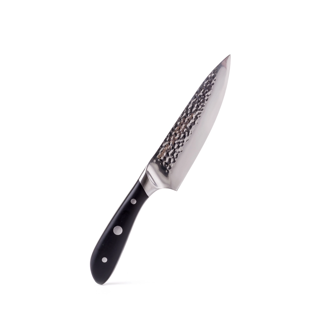 Поварской нож – незаменимый помощник на кухне. Им можно нарезать филе, нашинковать овощи, разделать мясо. Им также легко давить чеснок и другие специи, отбивать заготовки для стейков или разбивать панцирь крабов.Функциональность ножа обусловлена уникальной отделкой клинка Hammering, которая исключает трение и налипание продуктов на лезвие во время нарезки.