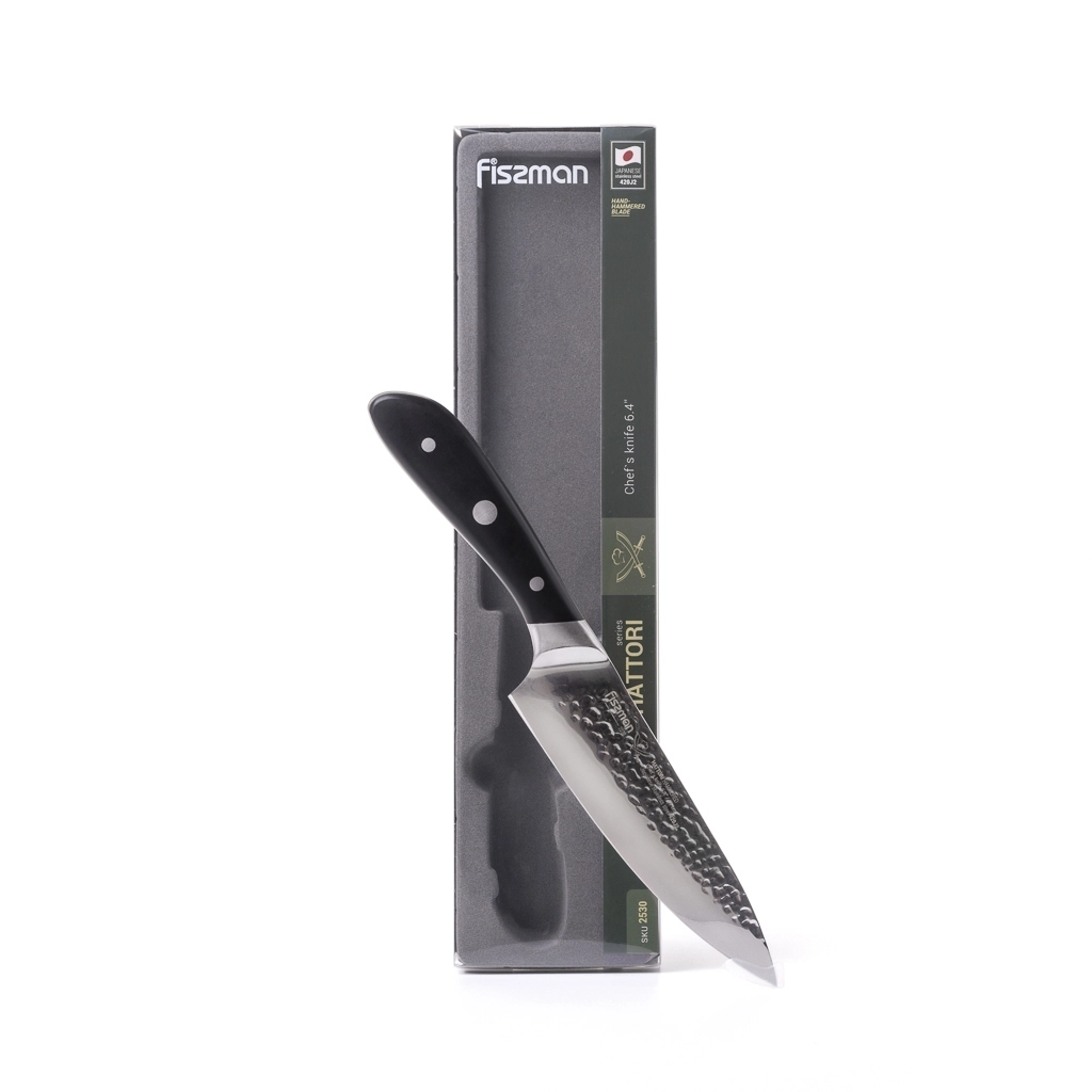 Рукоятка эргономичной формы из АБС пластика прочно зафиксирована тремя болтами. https://fissman.ru/catalog/kuhonnye-nozhi/nozhi-povarskie/nozhi-povarskie-iz-nerzhaveyushchey-stali/nozh-povarskoy-16-sm-hattori-hammered/