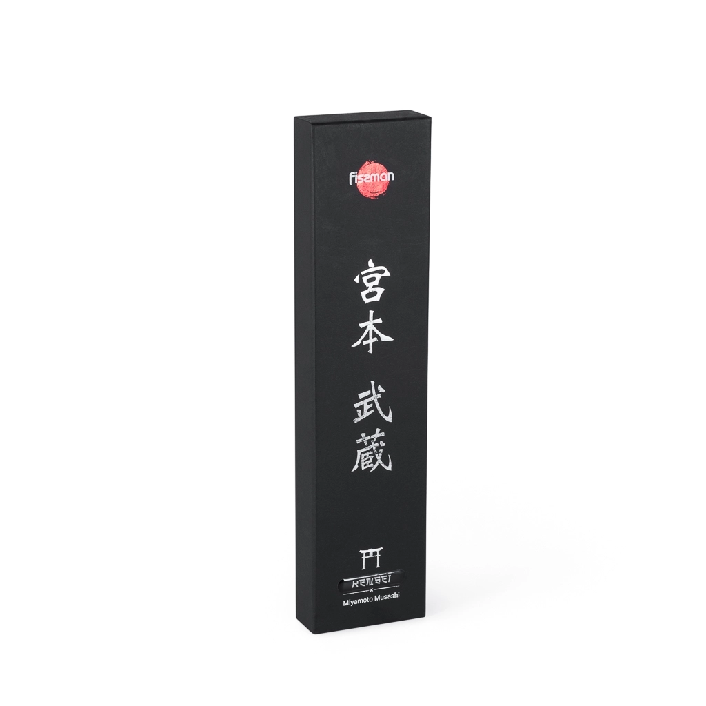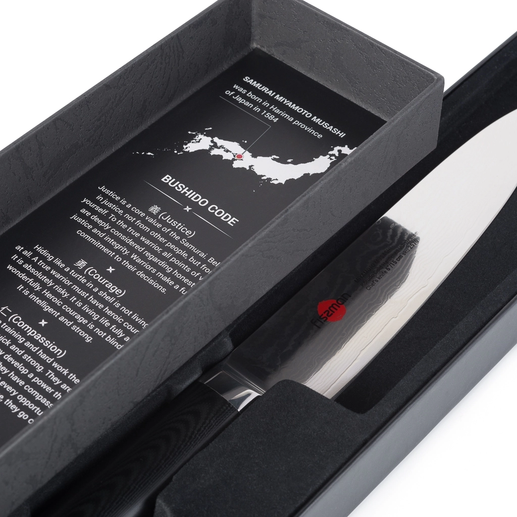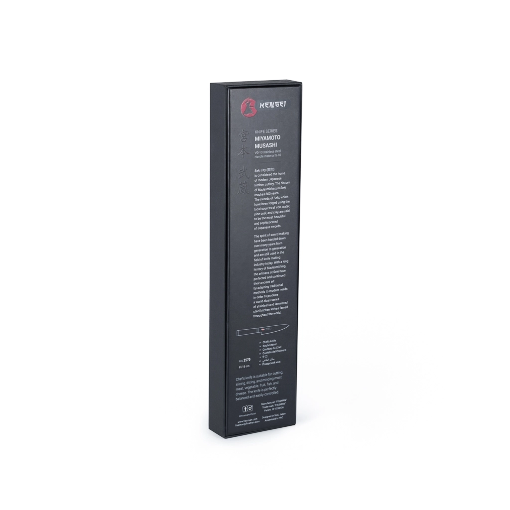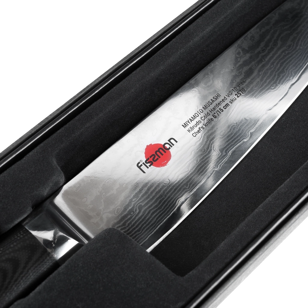 Поварской нож FISSMAN KENSEI MUSASHI 6" это нож с широким, прочным лезвием и тонко заточенным режущим краем. Настоящий универсальный инструмент для профессионалов и поваров-любителей. Если его режущую кромку мысленно разделить на три части, выяснится что он подходит для совершенно разных задач. Передней частью можно легко нашинковать лук или картофель, средняя часть прекрасно подходит для нарезки пряных трав, а задняя часть удобна для нарезки твердых продуктов. Традиционное японское мастерство в сочетании с передовыми технологиями и красивым современным дизайном. Устойчивость к коррозии и долговечность благодаря особой технологии закалки металла холодом Korudo до уровня 61 HRC по шкале Роквелла. Дамасское лезвие состоит из 67 слоев прочной нержавеющей суперстали VG-10. Наслаиваемые друг на друга пласты стали формируют неподражаемый узор напоминающий накатывающее море. Ремесленники вручную затачивают лезвия, используя старинный японский метод Хонбазукэ. Идеальный угол резки благодаря заточке 15-17 градусов на сторону. Рукоять ножа выполнена из высококлассного водонепроницаемого износостойкого материала G-10, который отлично выдерживает как низкие, так и высокие температуры и благодаря которому нож не скользит в руке и не впитывает посторонние запахи. Упаковка из текстурного картона премиум класса с серебряным тиснением не оставит равнодушным ни одного настоящего ценителя ножей высокого качества.