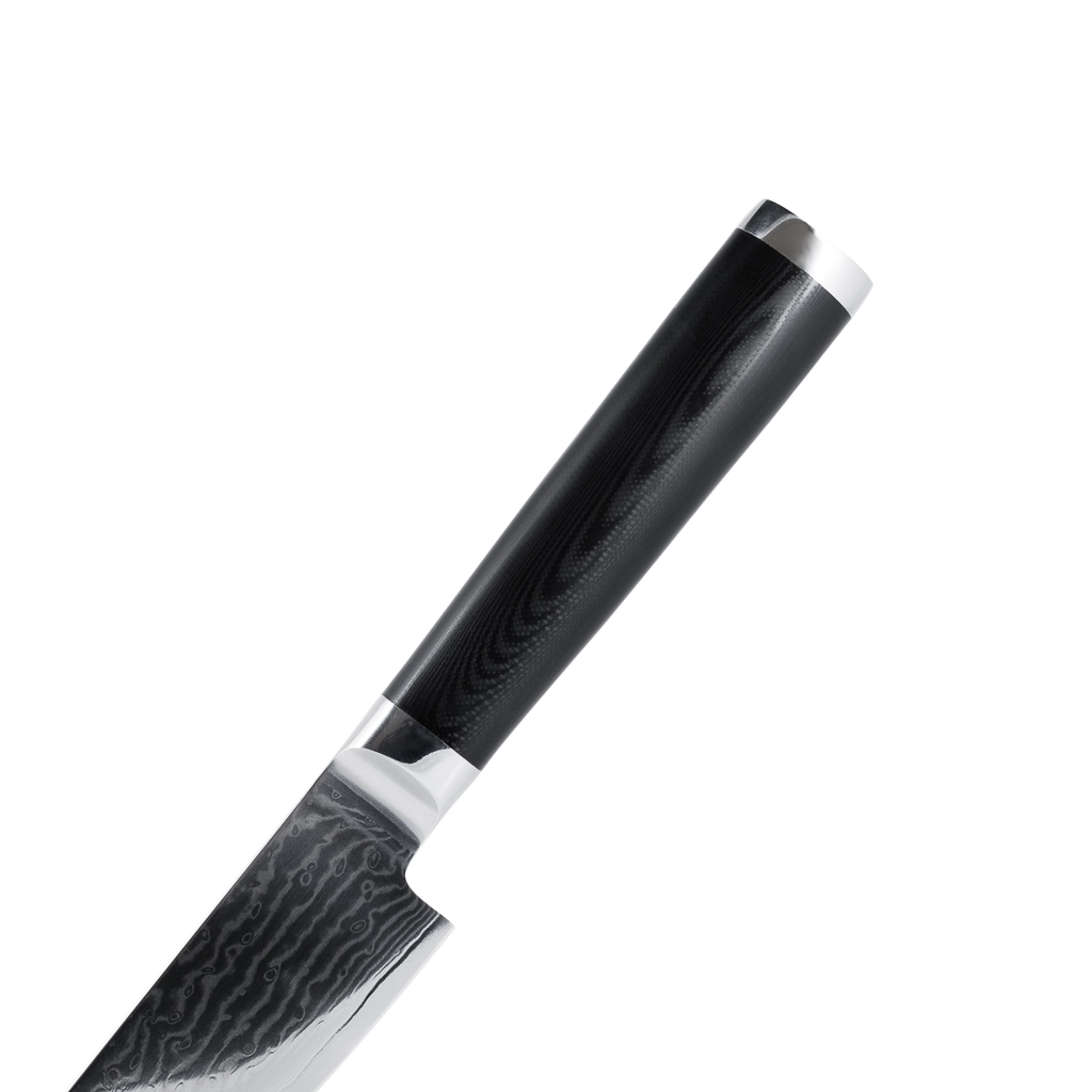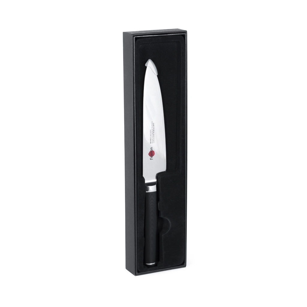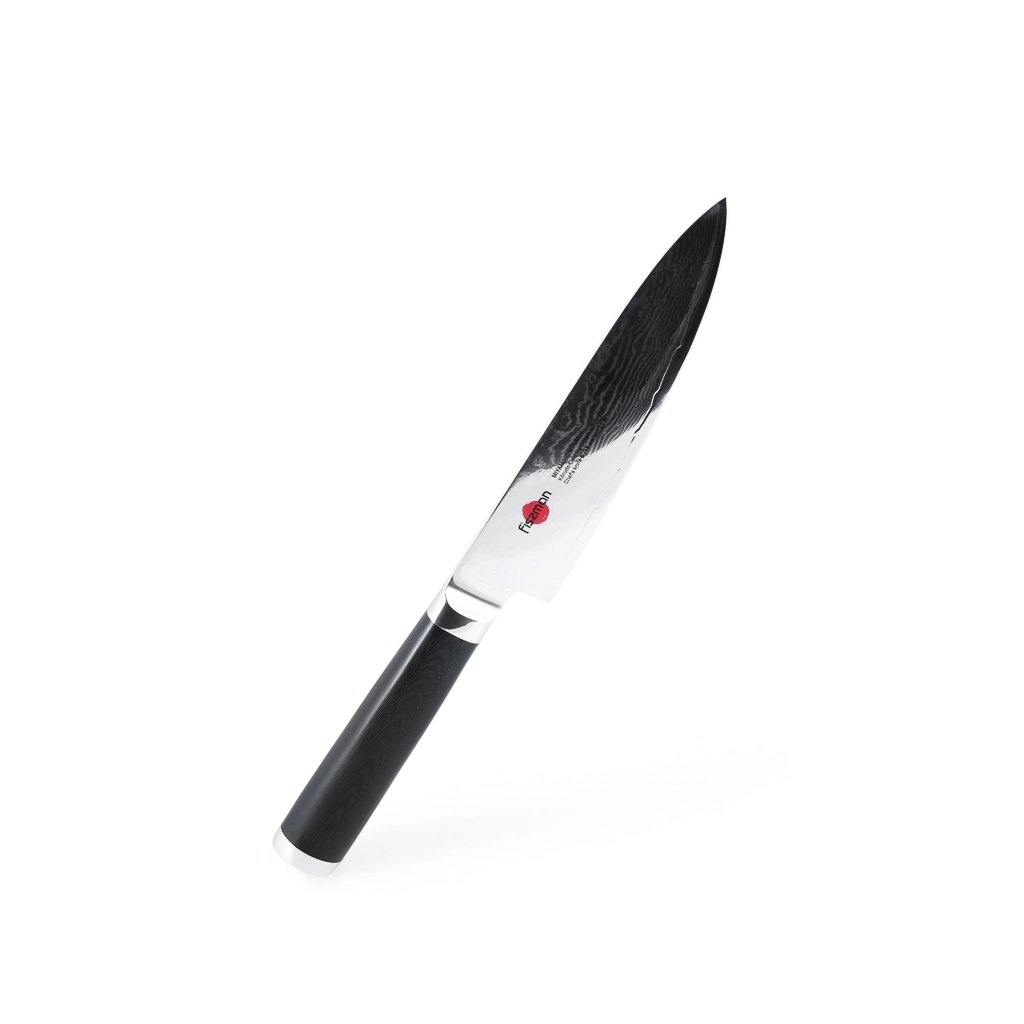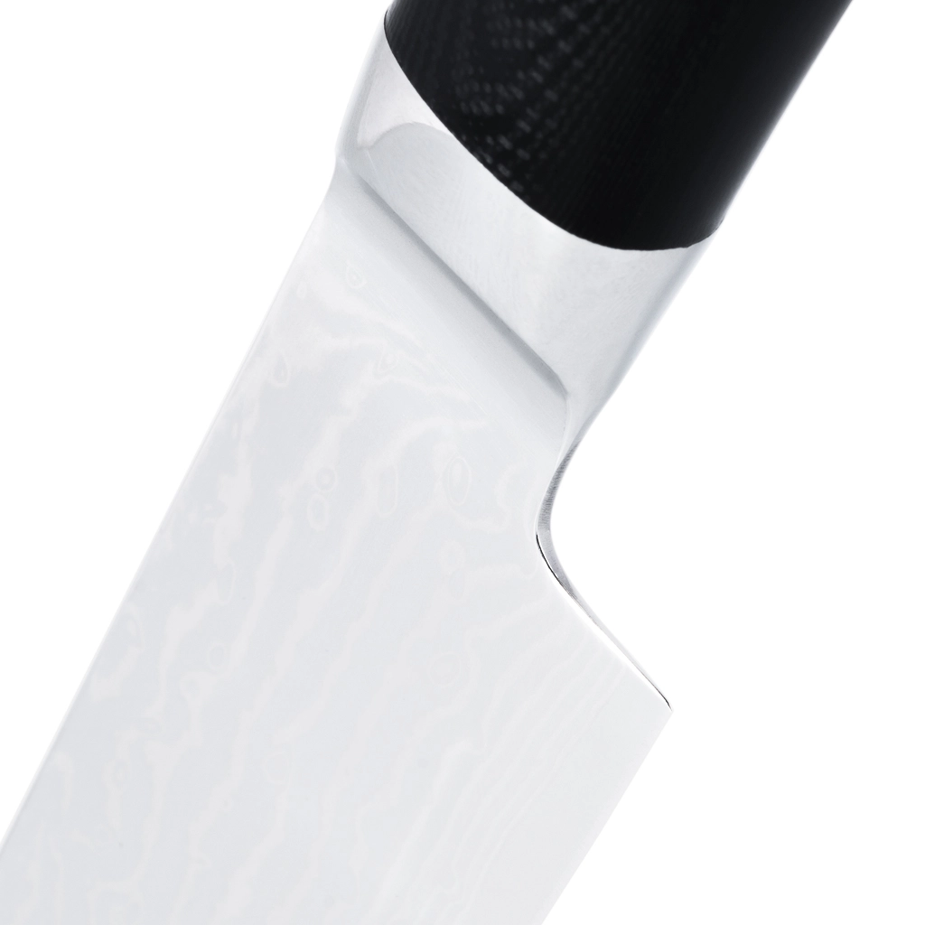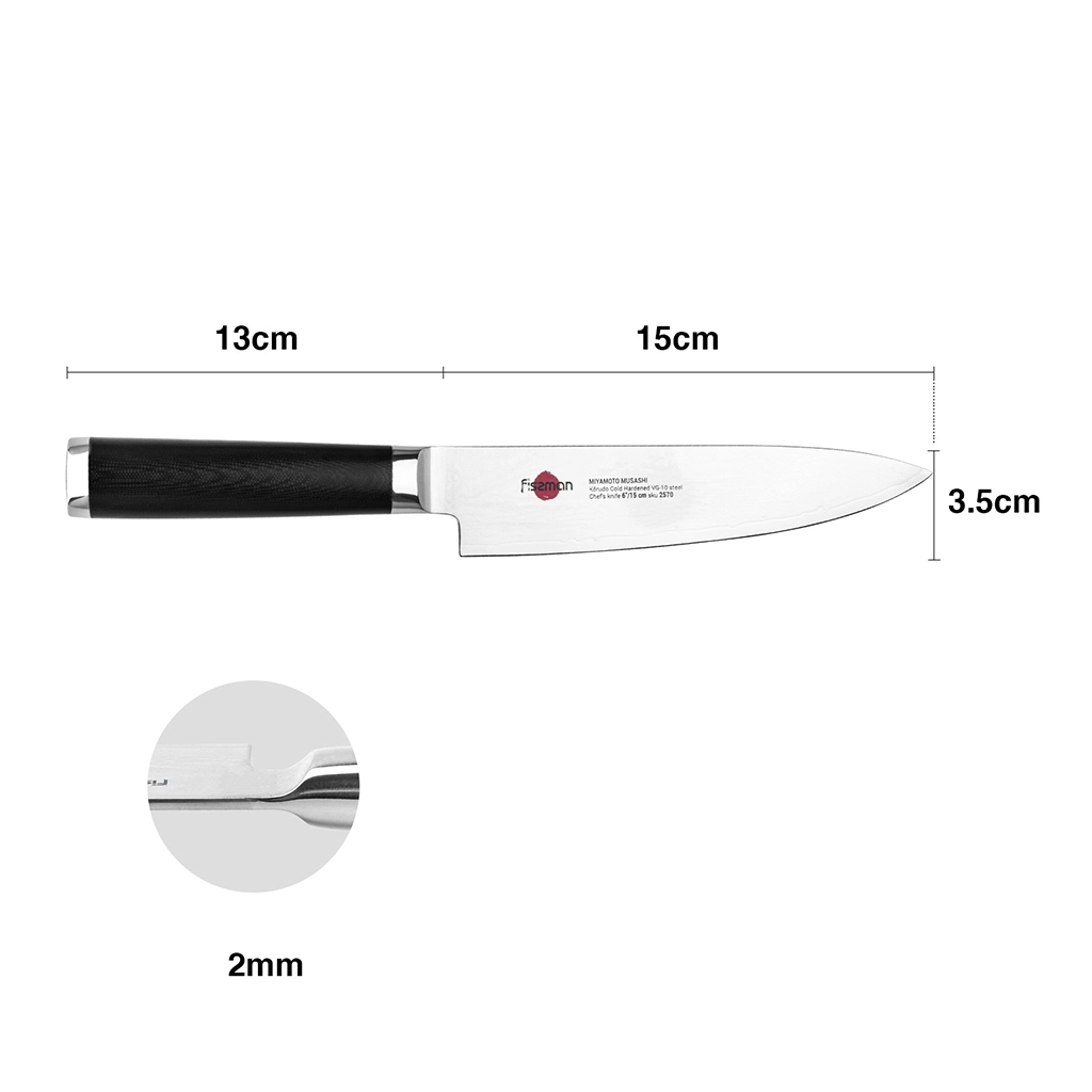 Поварской нож FISSMAN KENSEI MUSASHI 6" это нож с широким, прочным лезвием и тонко заточенным режущим краем. Настоящий универсальный инструмент для профессионалов и поваров-любителей. Если его режущую кромку мысленно разделить на три части, выяснится что он подходит для совершенно разных задач. Передней частью можно легко нашинковать лук или картофель, средняя часть прекрасно подходит для нарезки пряных трав, а задняя часть удобна для нарезки твердых продуктов. Традиционное японское мастерство в сочетании с передовыми технологиями и красивым современным дизайном. Устойчивость к коррозии и долговечность благодаря особой технологии закалки металла холодом Korudo до уровня 61 HRC по шкале Роквелла. Дамасское лезвие состоит из 67 слоев прочной нержавеющей суперстали VG-10. Наслаиваемые друг на друга пласты стали формируют неподражаемый узор напоминающий накатывающее море. Ремесленники вручную затачивают лезвия, используя старинный японский метод Хонбазукэ. Идеальный угол резки благодаря заточке 15-17 градусов на сторону. Рукоять ножа выполнена из высококлассного водонепроницаемого износостойкого материала G-10, который отлично выдерживает как низкие, так и высокие температуры и благодаря которому нож не скользит в руке и не впитывает посторонние запахи. Упаковка из текстурного картона премиум класса с серебряным тиснением не оставит равнодушным ни одного настоящего ценителя ножей высокого качества.