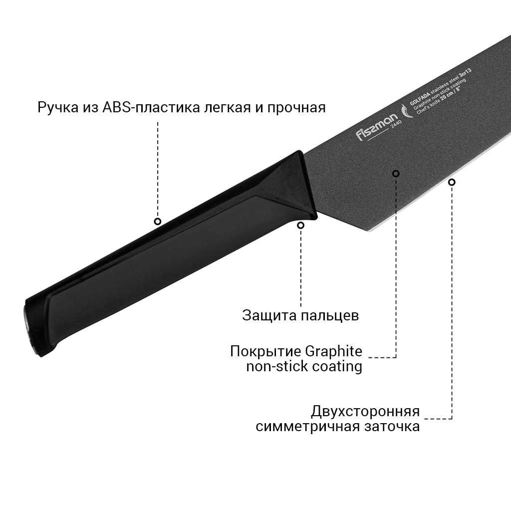 Благодаря покрытию Graphite non-stick coating продукты не прилипают к клинку при нарезании, а сталь максимально защищена от повреждений.