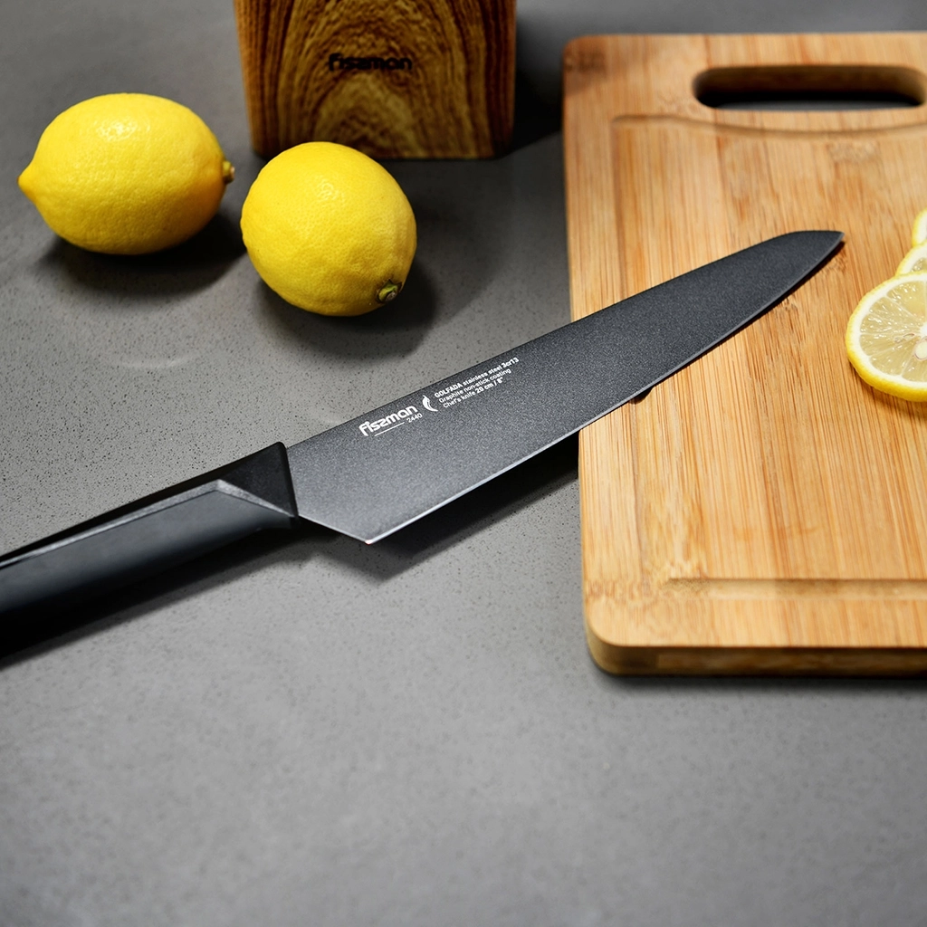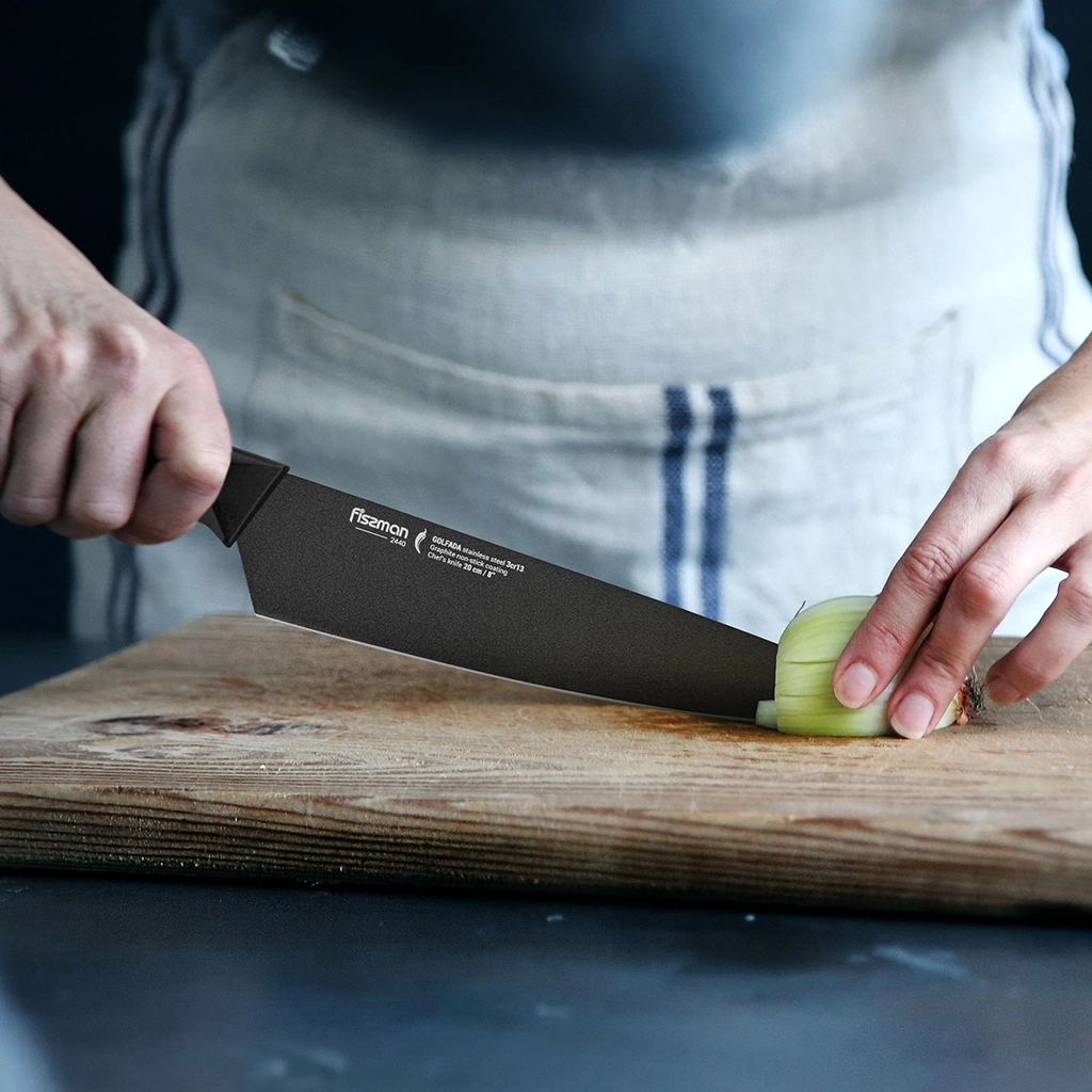 Кухонные ножи серии GOLFADA изготовлены из стали 3Cr13, созданной азиатскими технологами. Металлургам удалось получить материал с отличными эксплуатационными характеристиками.