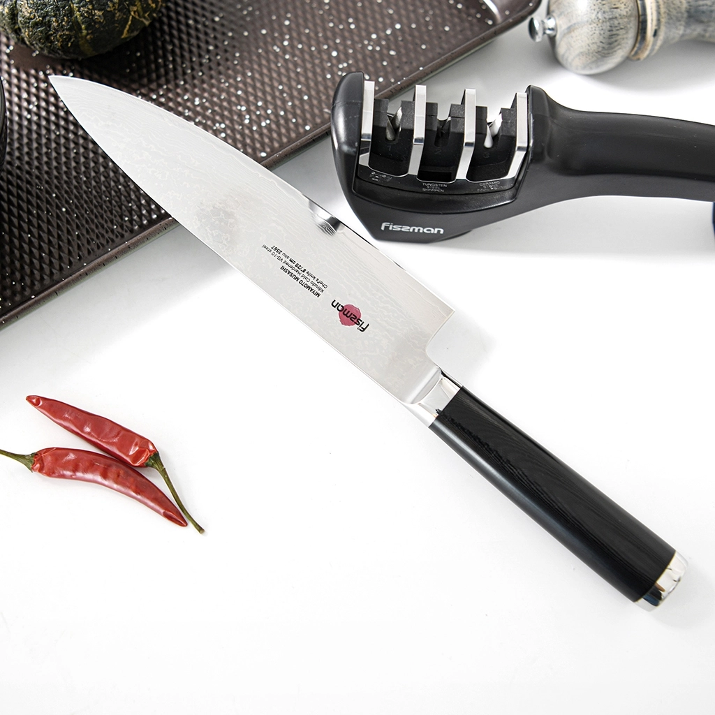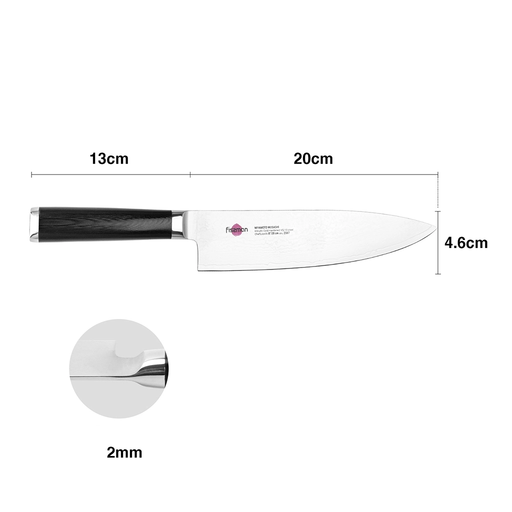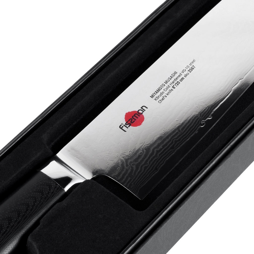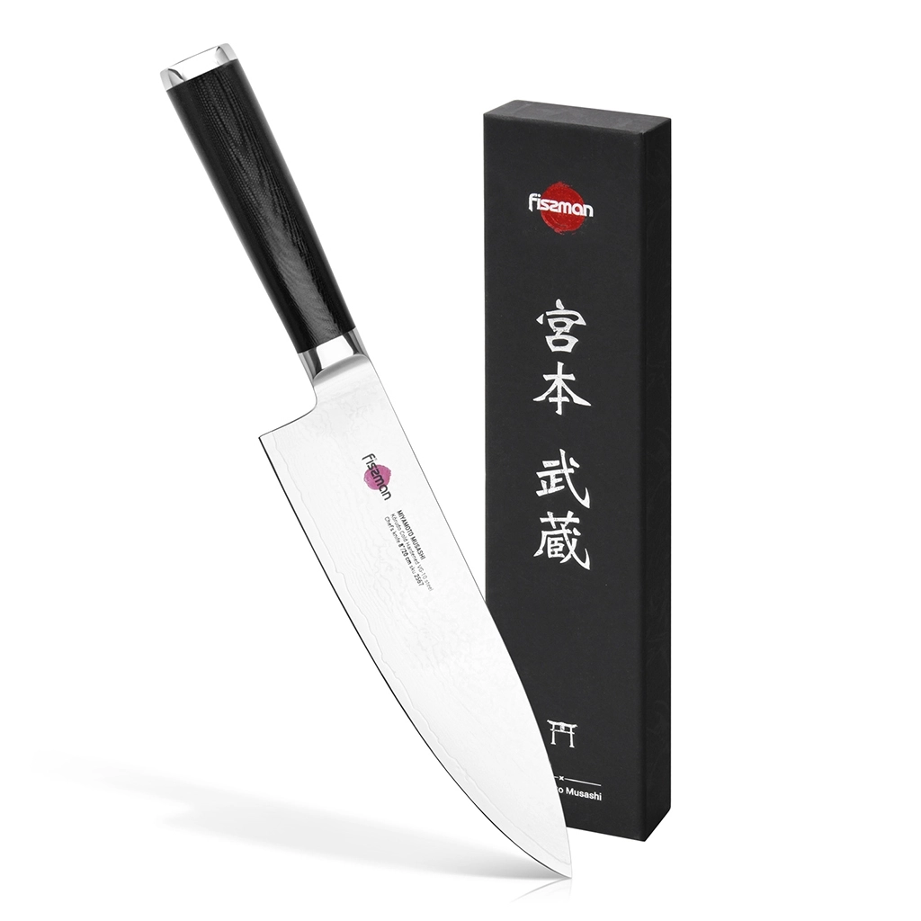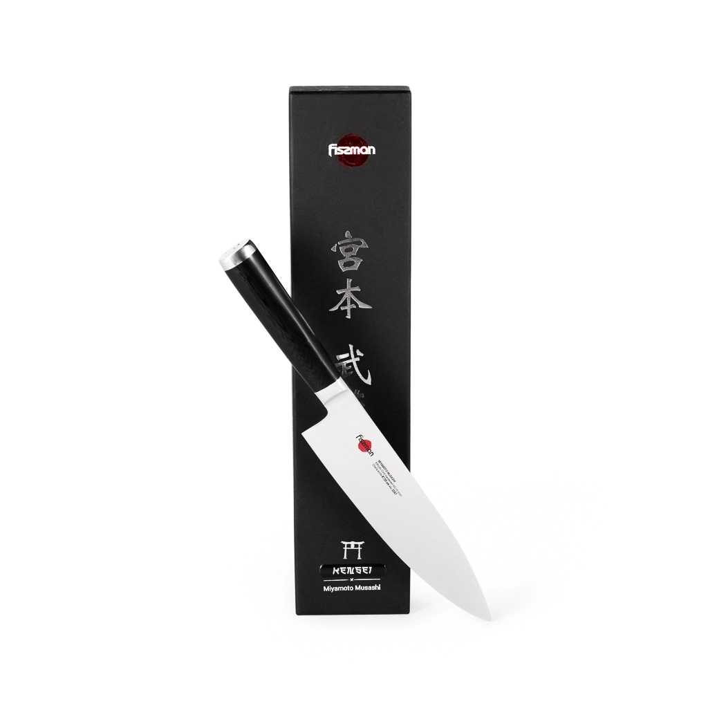 Поварской нож FISSMAN KENSEI MUSASHI 8" это нож с широким, прочным лезвием и тонко заточенным режущим краем. Настоящий универсальный инструмент для профессионалов и поваров-любителей. Если его режущую кромку мысленно разделить на три части, выяснится что он подходит для совершенно разных задач. Передней частью можно легко нашинковать лук или картофель, средняя часть прекрасно подходит для нарезки пряных трав, а задняя часть удобна для нарезки твердых продуктов. Традиционное японское мастерство в сочетании с передовыми технологиями и красивым современным дизайном. Устойчивость к коррозии и долговечность благодаря особой технологии закалки металла холодом Korudo до уровня 61 HRC по шкале Роквелла. Дамасское лезвие состоит из 67 слоев прочной нержавеющей суперстали VG-10. Наслаиваемые друг на друга пласты стали формируют неподражаемый узор напоминающий накатывающее море. Ремесленники вручную затачивают лезвия, используя старинный японский метод Хонбазукэ. Идеальный угол резки благодаря заточке 15-17 градусов на сторону. Рукоять ножа выполнена из высококлассного водонепроницаемого износостойкого материала G-10, который отлично выдерживает как низкие, так и высокие температуры и благодаря которому нож не скользит в руке и не впитывает посторонние запахи. Упаковка из текстурного картона премиум класса с серебряным тиснением не оставит равнодушным ни одного настоящего ценителя ножей высокого качества.