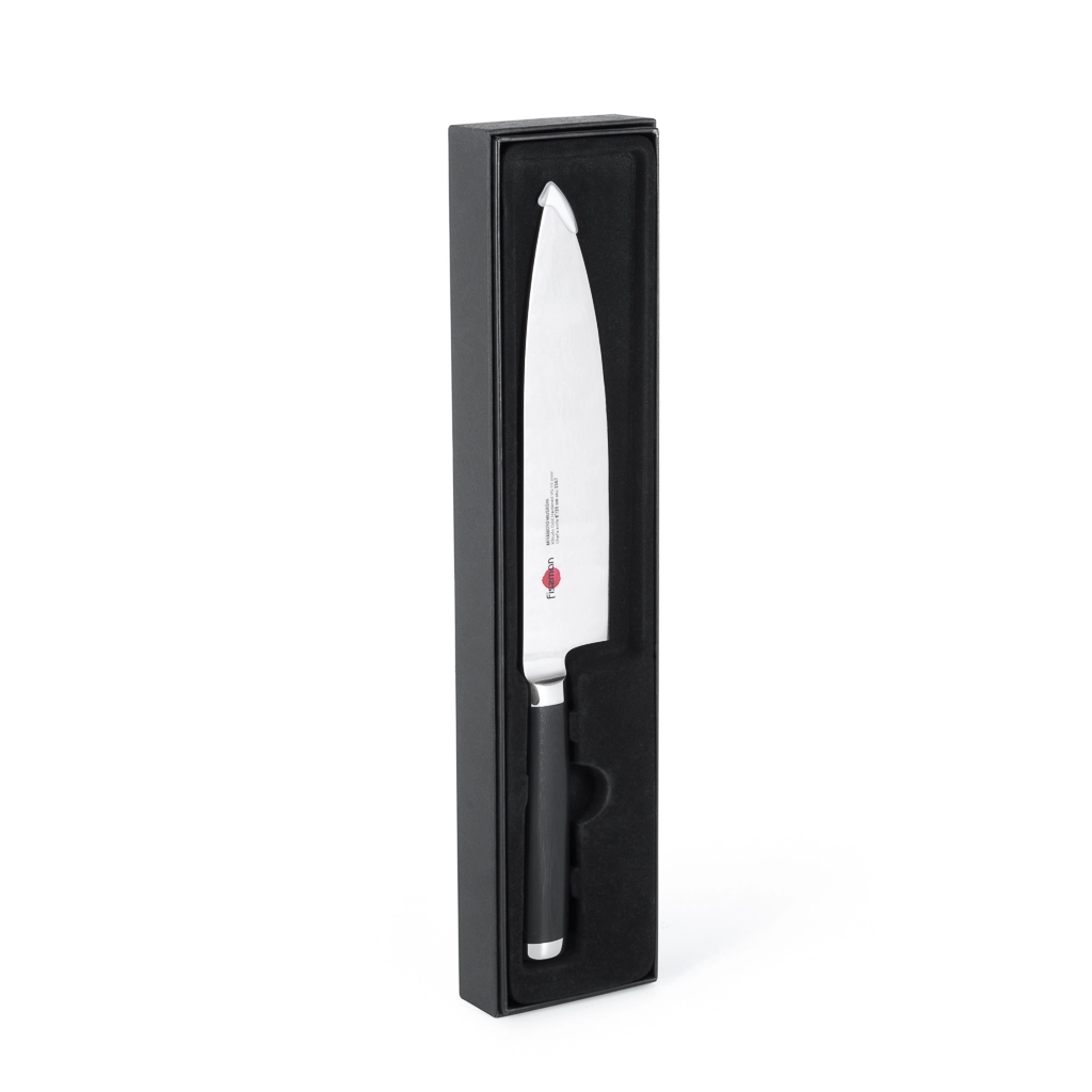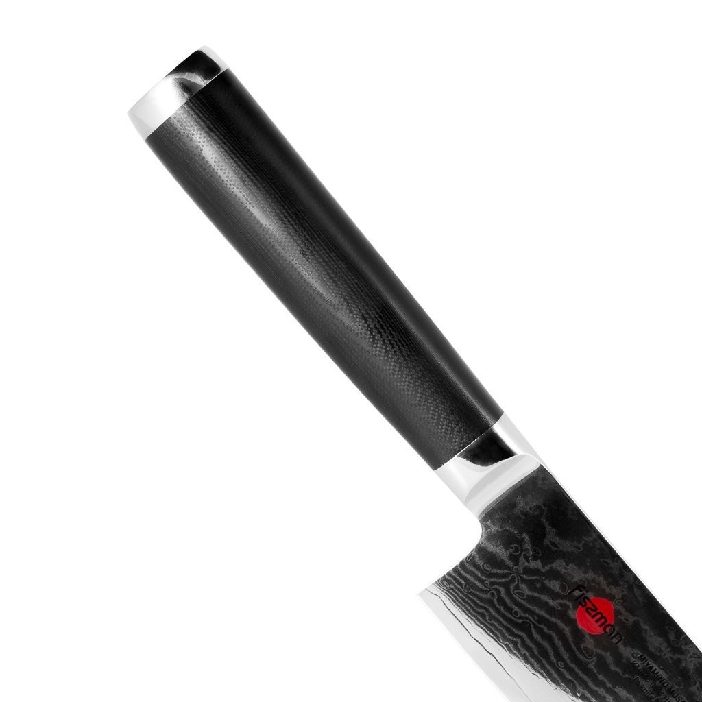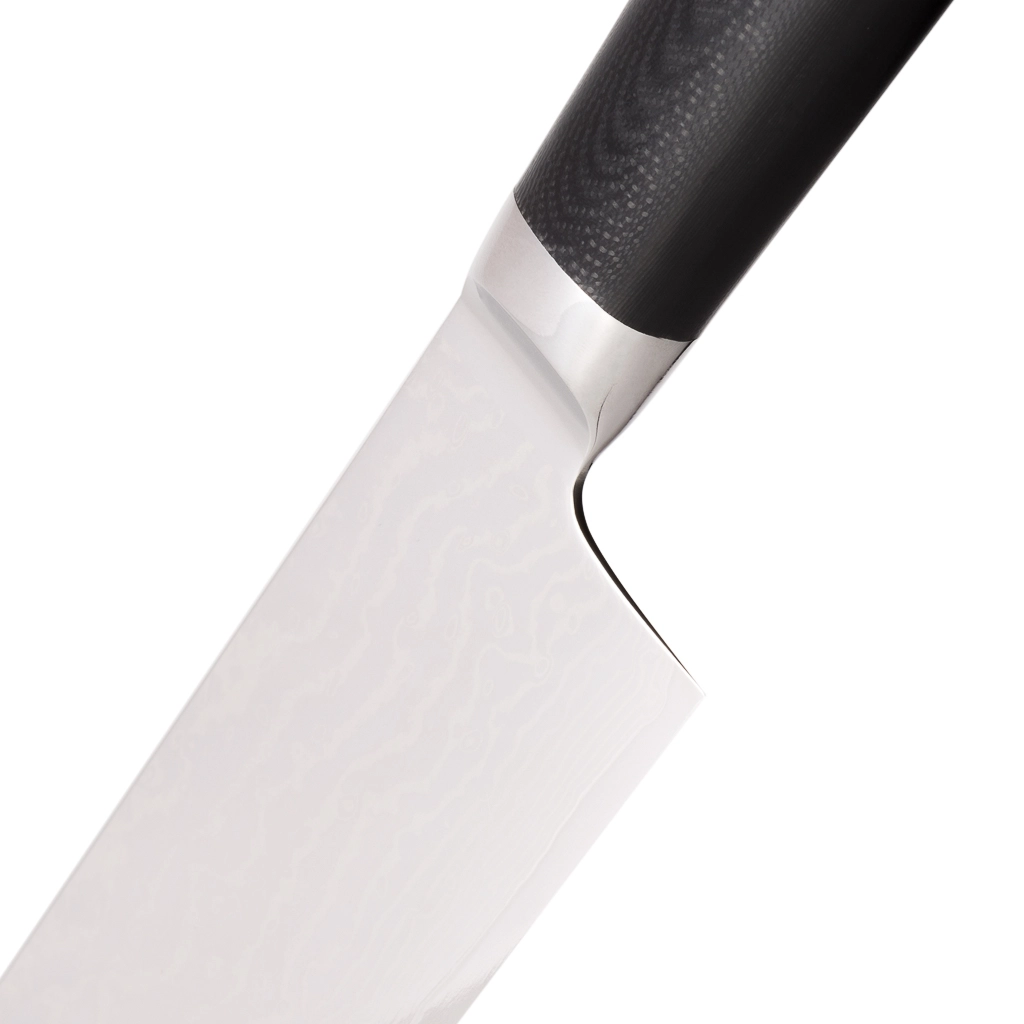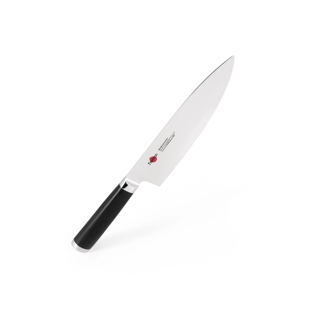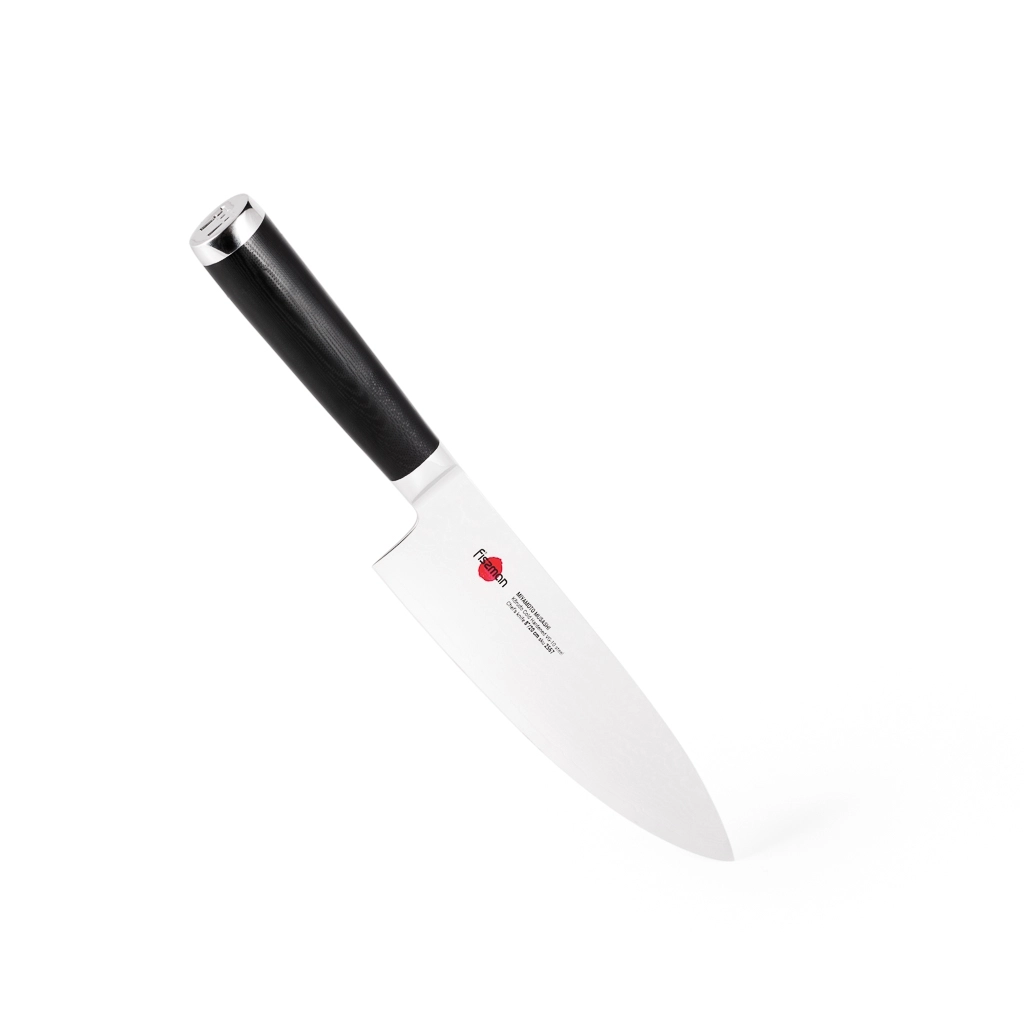 Поварской нож FISSMAN KENSEI MUSASHI 8" это нож с широким, прочным лезвием и тонко заточенным режущим краем. Настоящий универсальный инструмент для профессионалов и поваров-любителей. Если его режущую кромку мысленно разделить на три части, выяснится что он подходит для совершенно разных задач. Передней частью можно легко нашинковать лук или картофель, средняя часть прекрасно подходит для нарезки пряных трав, а задняя часть удобна для нарезки твердых продуктов. Традиционное японское мастерство в сочетании с передовыми технологиями и красивым современным дизайном. Устойчивость к коррозии и долговечность благодаря особой технологии закалки металла холодом Korudo до уровня 61 HRC по шкале Роквелла. Дамасское лезвие состоит из 67 слоев прочной нержавеющей суперстали VG-10. Наслаиваемые друг на друга пласты стали формируют неподражаемый узор напоминающий накатывающее море. Ремесленники вручную затачивают лезвия, используя старинный японский метод Хонбазукэ. Идеальный угол резки благодаря заточке 15-17 градусов на сторону. Рукоять ножа выполнена из высококлассного водонепроницаемого износостойкого материала G-10, который отлично выдерживает как низкие, так и высокие температуры и благодаря которому нож не скользит в руке и не впитывает посторонние запахи. Упаковка из текстурного картона премиум класса с серебряным тиснением не оставит равнодушным ни одного настоящего ценителя ножей высокого качества.