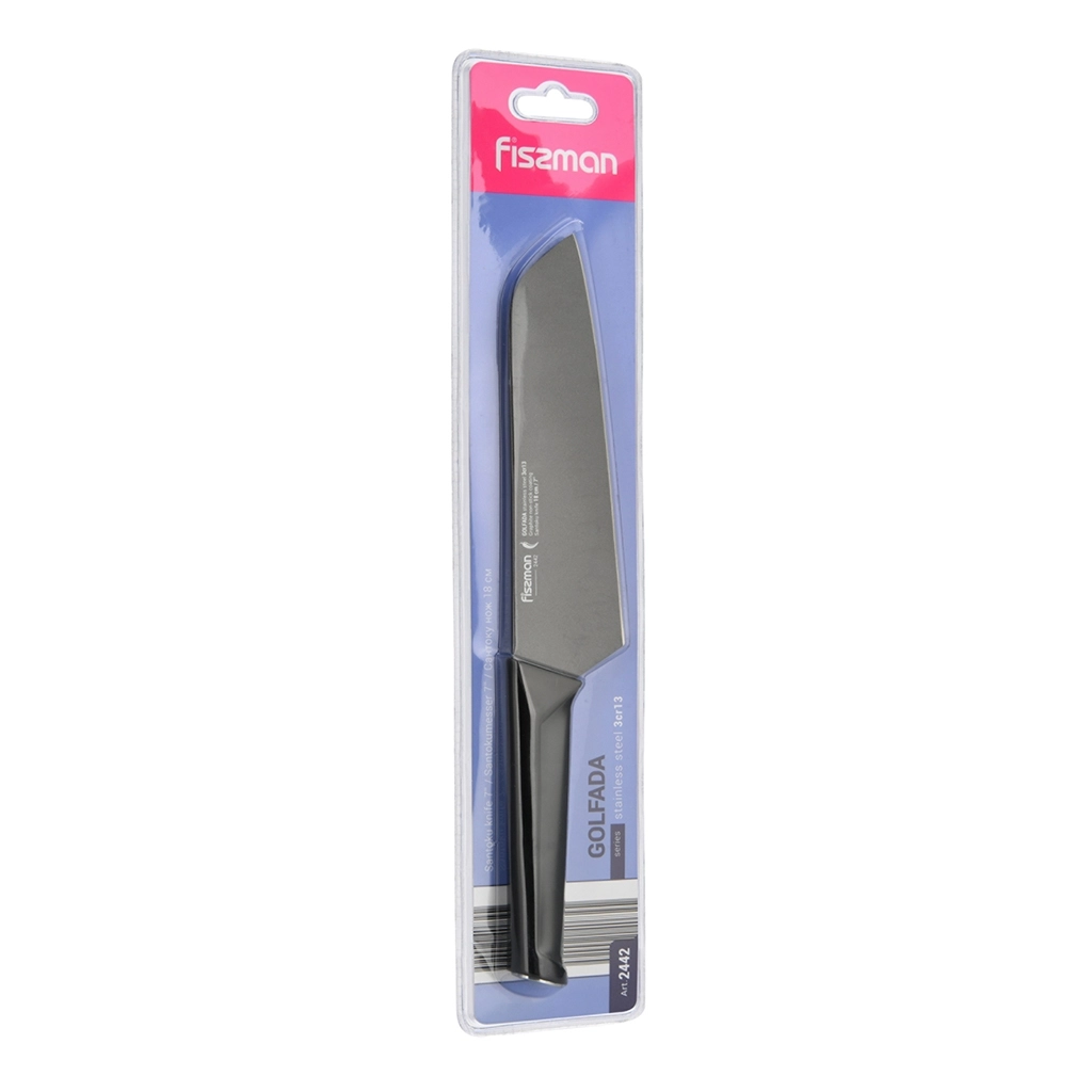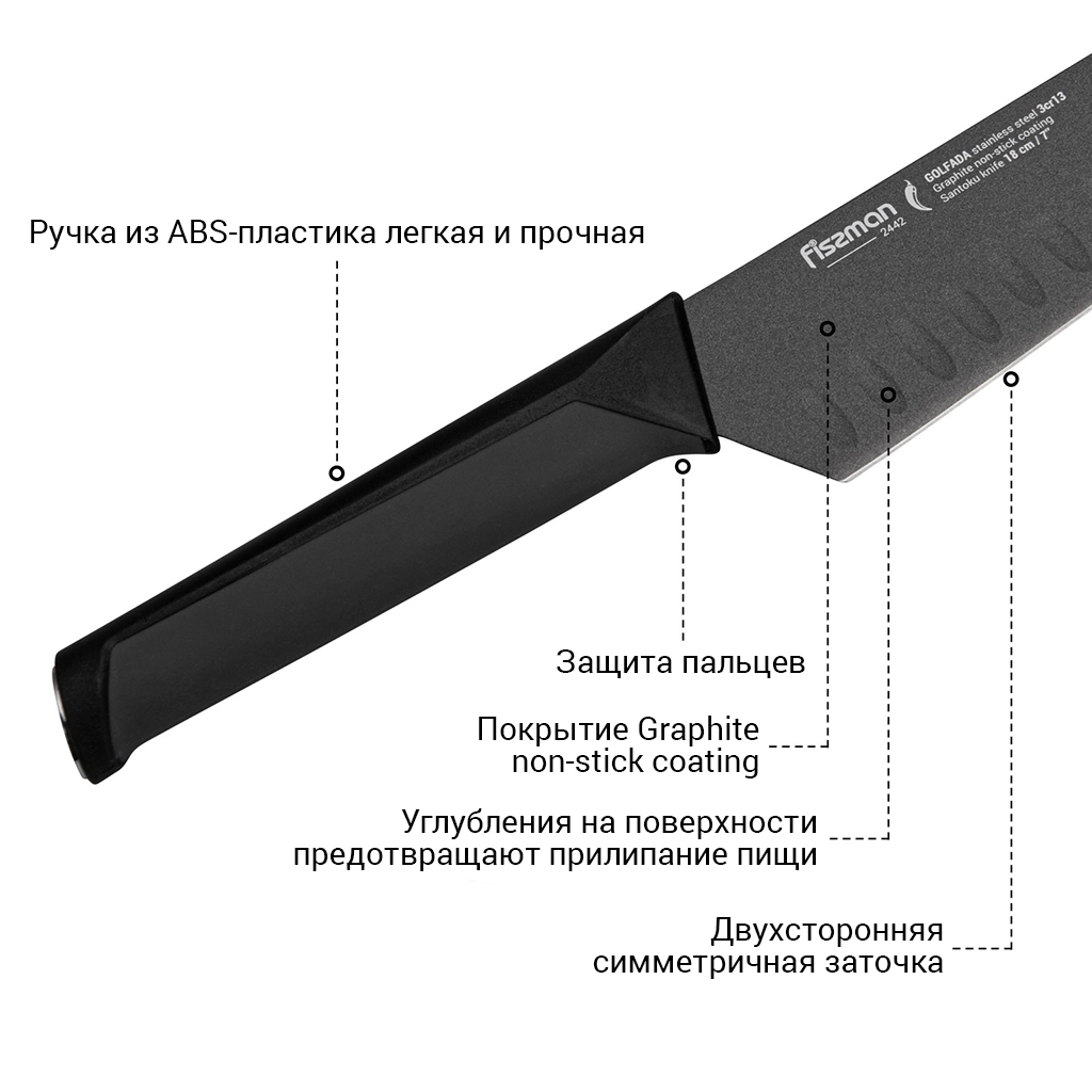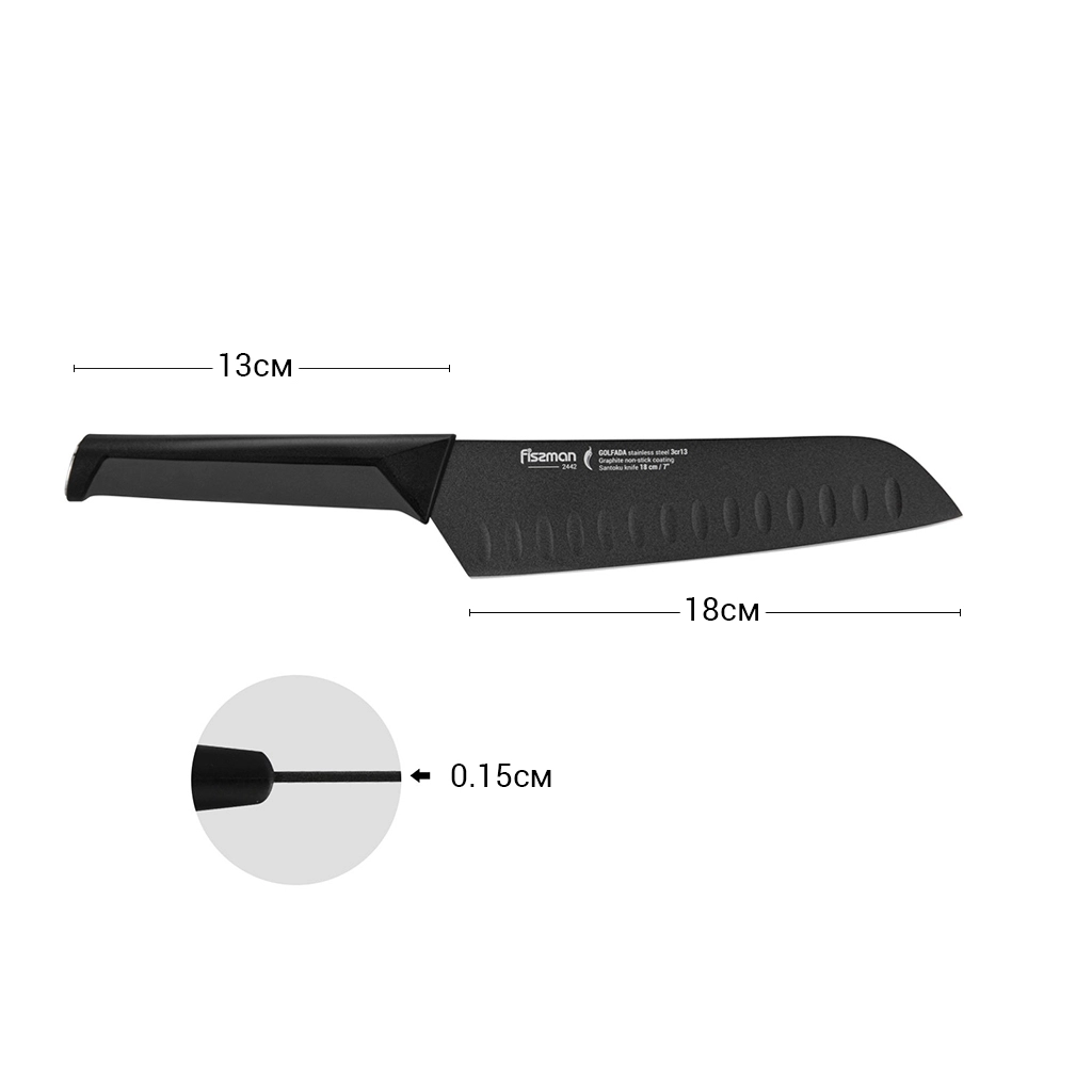 К достоинствам ножей из 3Cr13 нужно отнести прочность, твердость, устойчивость к износу. https://fissman.ru/catalog/kuhonnye-nozhi/nozhi-santoku/nozhi-santoku-dlina-klinka-18-sm/nozh-santoku-18-sm-golfada/