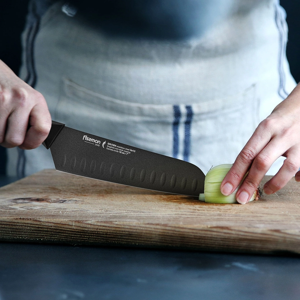 Кухонные ножи серии GOLFADA изготовлены из стали 3Cr13, созданной азиатскими технологами. Металлургам удалось получить материал с отличными эксплуатационными характеристиками.