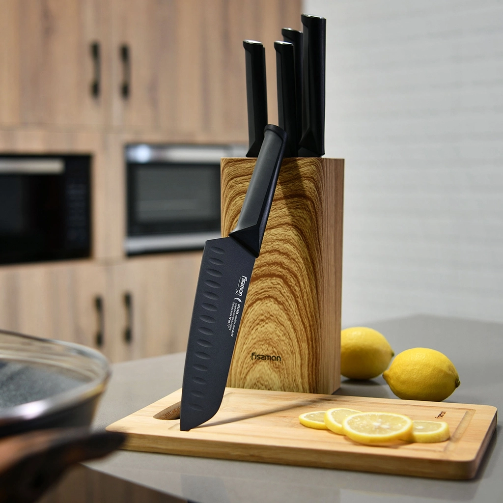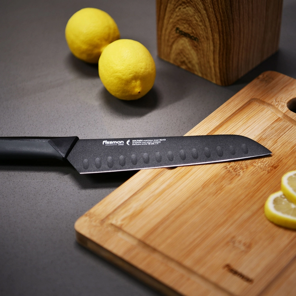 Нож Сантоку предназначен для шинковки овощей, тонкой нарезки, разделки мяса и рыбы. Углубления на поверхности облегчают использование: в них при нарезке остается воздух, поэтому продукты не налипают на лезвие.