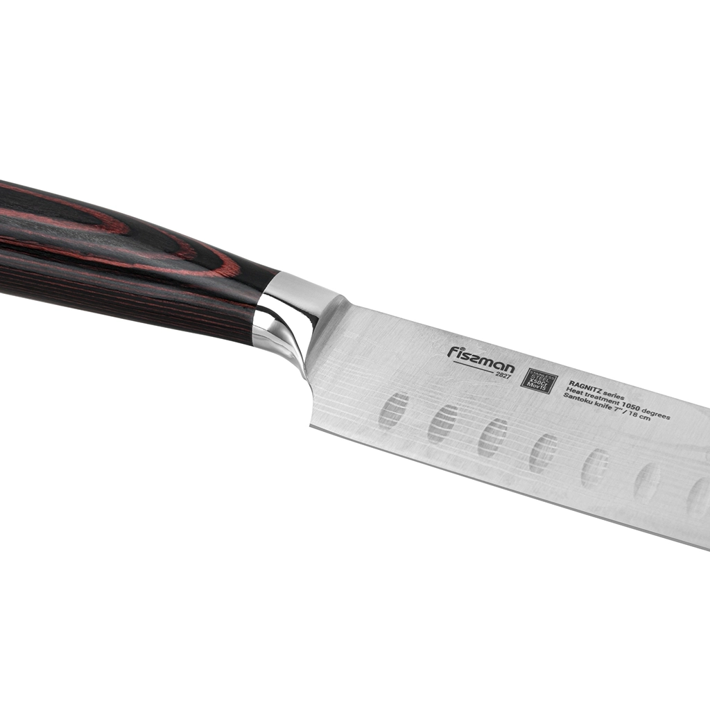 Кухонные ножи серии RAGNITZ выполнены из высоколегированной немецкой стали X50Cr15MoV, закалённой до 57 единиц по шкале Роквелла. Они обладают повышенной прочностью и подходят для частого использования. Лезвия имеют двухстороннюю симметричную заточку по всей длине режущей кромки, что обеспечивает лёгкую нарезку и разделку. Рукоятки из материала Pakka имеют элегантную форму и обеспечивают надёжный захват. Изготовленные по особой технологии они очень удобны и эргономичны. Благодаря этой конструкции ножи безупречно сбалансированы и хорошо лежат в руке. https://fissman.ru/catalog/kuhonnye-nozhi/nozhi-santoku/nozhi-santoku-dlina-klinka-18-sm/nozh-santoku-18-sm-ragnitz-art-2827/