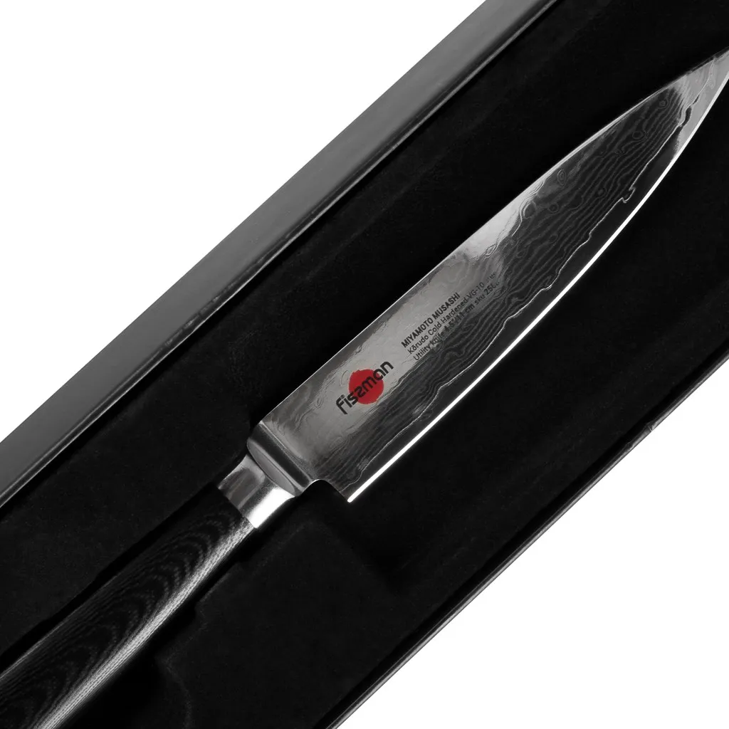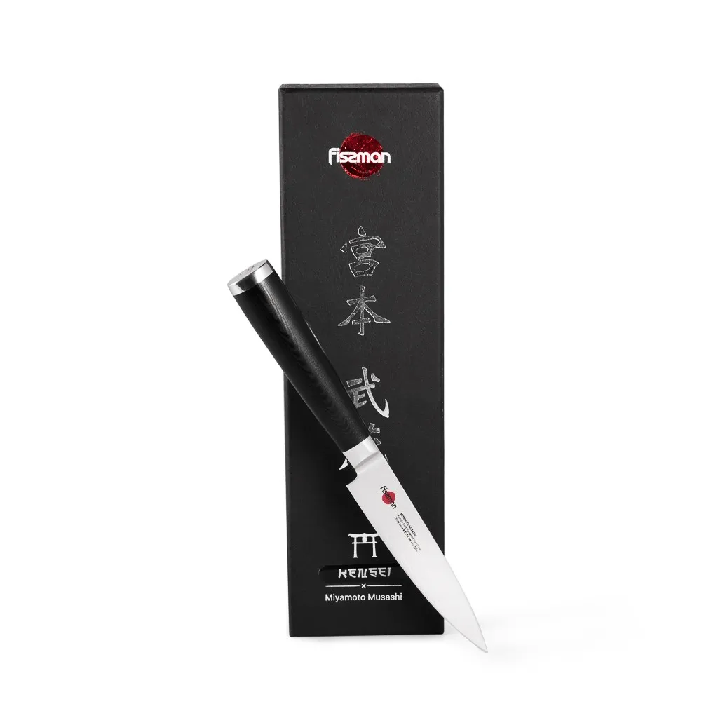 Универсальный нож меньше поварского, но несколько больше овощного, что делает его прекрасным инструментом для решения множества задач которые встречаются на кухне. Универсальный нож FISSMAN KENSEI MUSASHI 4.5" идеально подходит для измельчения различных душистых трав, чеснока, имбиря, а также для нарезки овощей или небольших кусков мяса. Устойчивость к коррозии и долговечность благодаря особой технологии закалки металла холодом Korudo до уровня 61 HRC по шкале Роквелла. Дамасское лезвие состоит из 67 слоев прочной нержавеющей суперстали VG-10. Наслаиваемые друг на друга пласты стали формируют неподражаемый узор напоминающий накатывающее море. Ремесленники вручную затачивают лезвия, используя старинный японский метод Хонбазукэ. Идеальный угол резки благодаря заточке 15-17 градусов на сторону. Рукоять ножа выполнена из высококлассного водонепроницаемого износостойкого материала G-10, который отлично выдерживает как низкие, так и высокие температуры и благодаря которому нож не скользит в руке и не впитывает посторонние запахи. Упаковка из текстурного картона премиум класса с серебряным тиснением не оставит равнодушным ни одного настоящего ценителя ножей высокого качества.