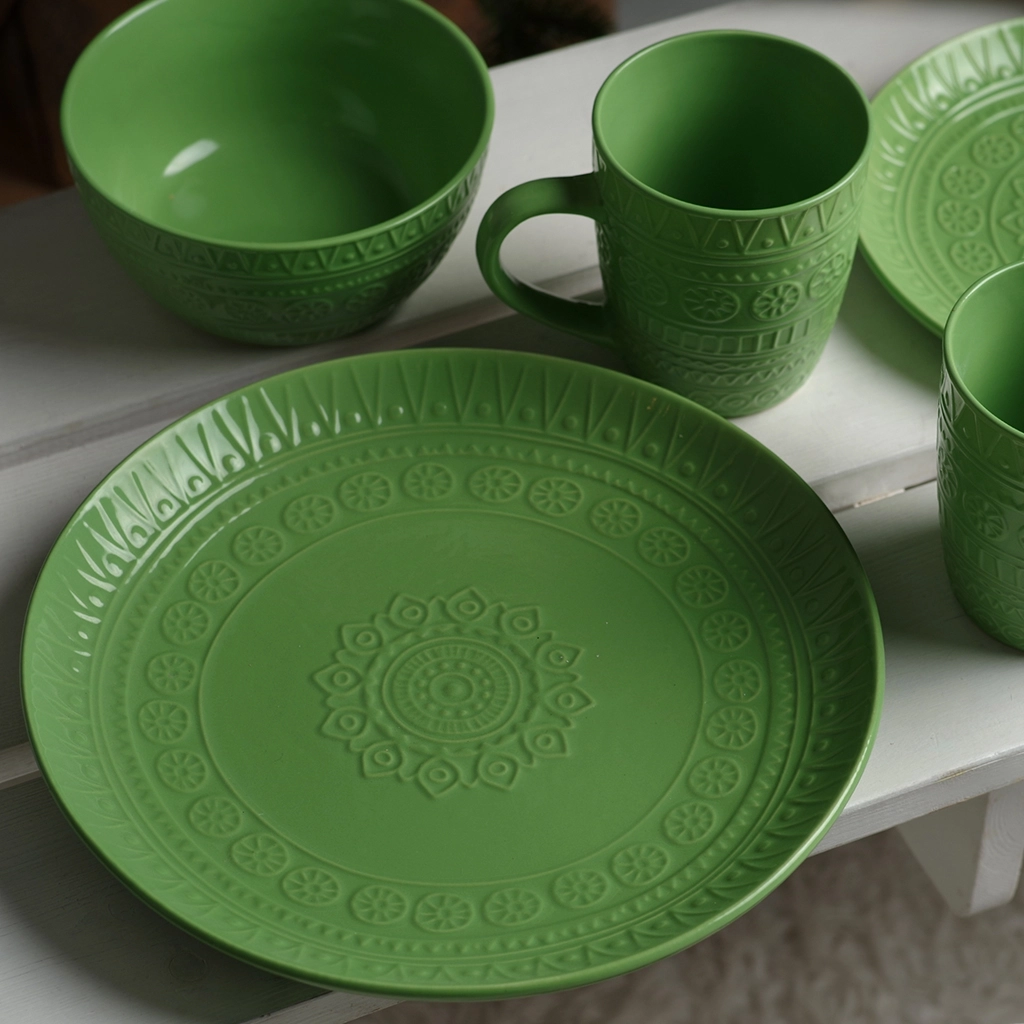 Набор из 16 предметов включает в себя: тарелки D 20,8 см / 4 шт; тарелки D 27,8 см / 4 шт; пиалы D 15,2 cм / 660 мл / 4 шт; кружки 440 мл / 4 шт.