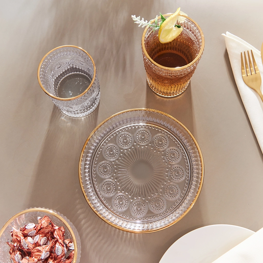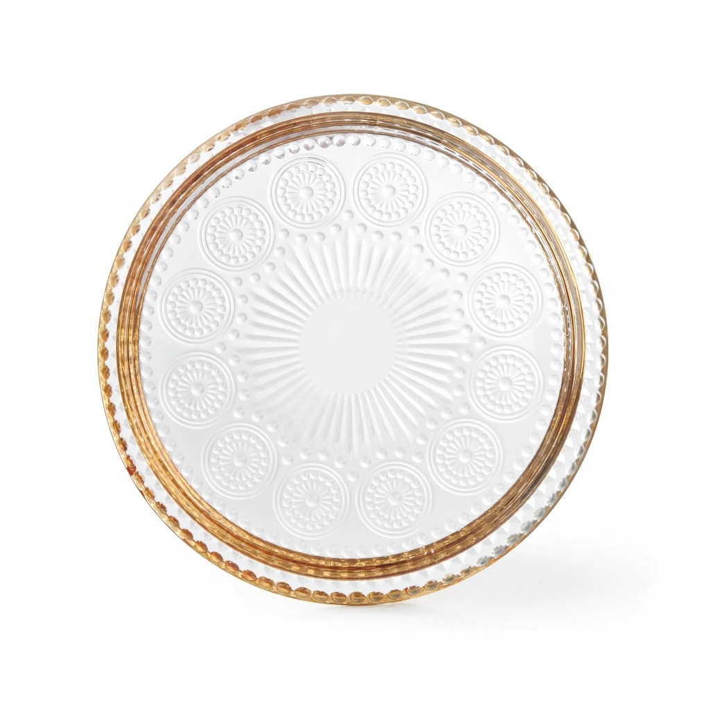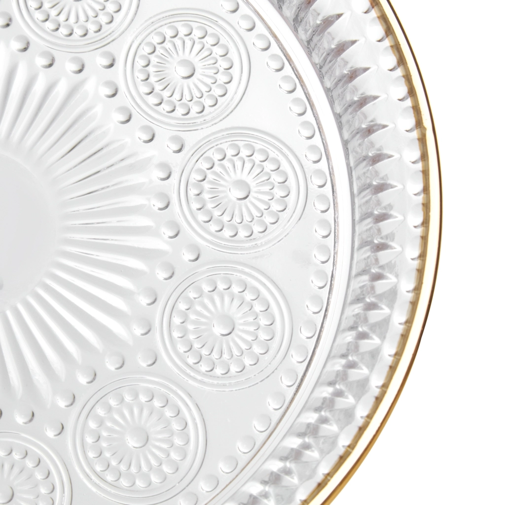 Тарелка из стекла с золотой окантовкой — изысканный элемент сервировки стола. Изготовленная из высококачественного прозрачного стекла, она обладает прочностью и долговечностью. Золотая кайма придаёт тарелке роскошный вид, делая её превосходным дополнением к праздничному столу. https://fissman.ru/catalog/servirovka-stola/blyuda/blyuda-dlya-zakusok/blyudo-servirovochnoe-17-5-sm-art-19098/